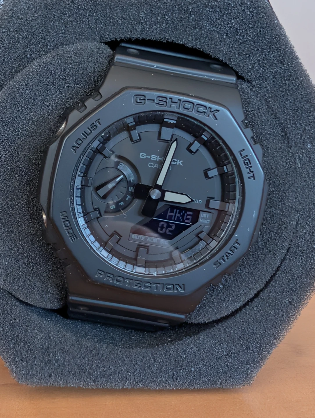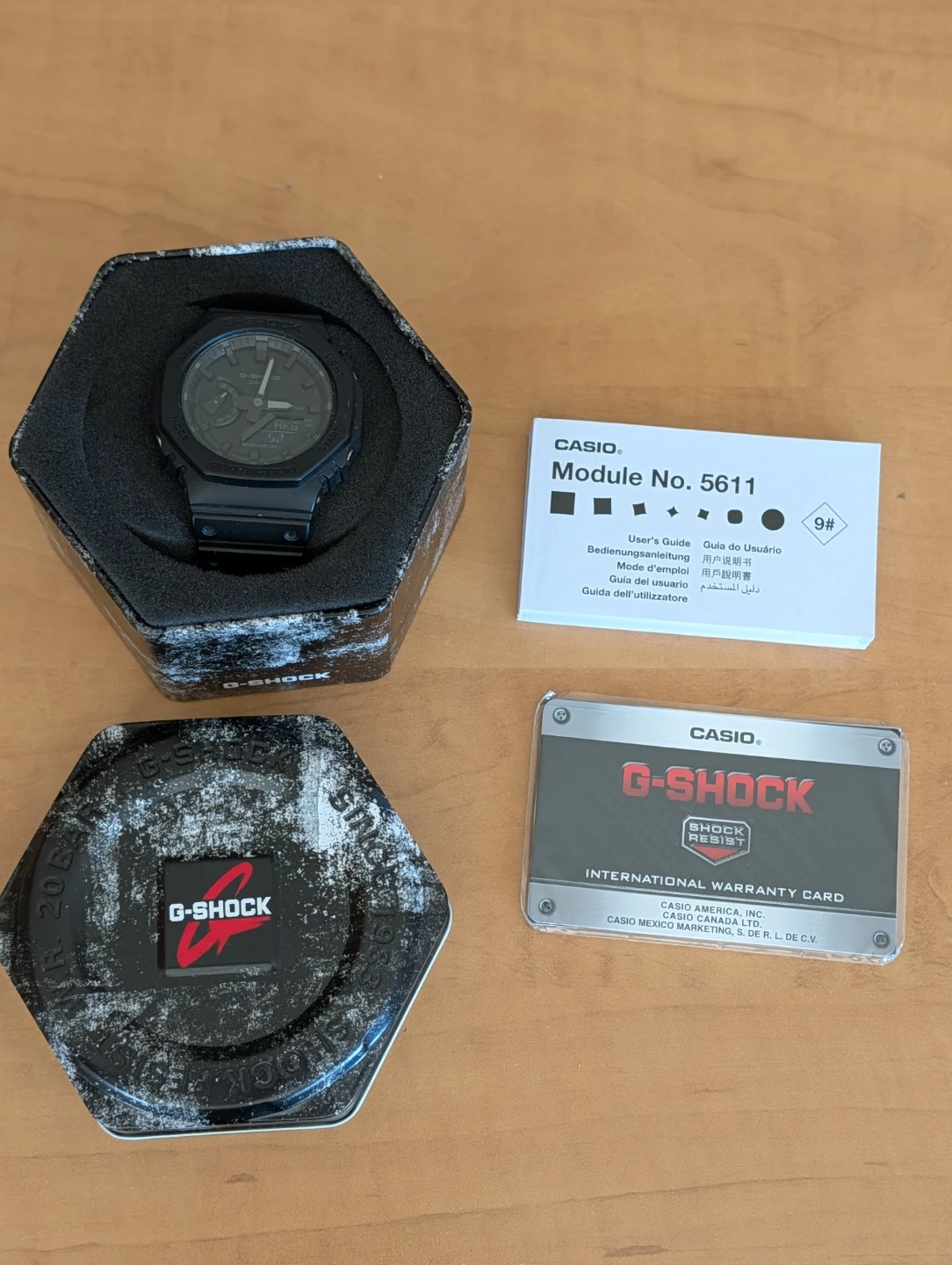 This is a black G-Shock watch. It comes with the original box, user's guide, and international warranty card. This watch is known for its durability and shock resistance!