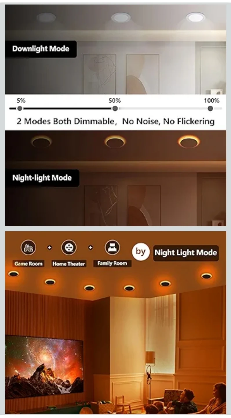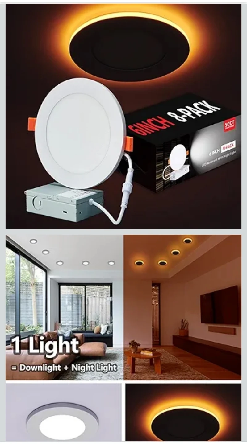 This is an 8-pack of Togalonn 6-inch LED recessed lights. They offer downlight and night light modes, both of which are dimmable. These lights are slim, wafer-style downlights with ETL and IC ratings.