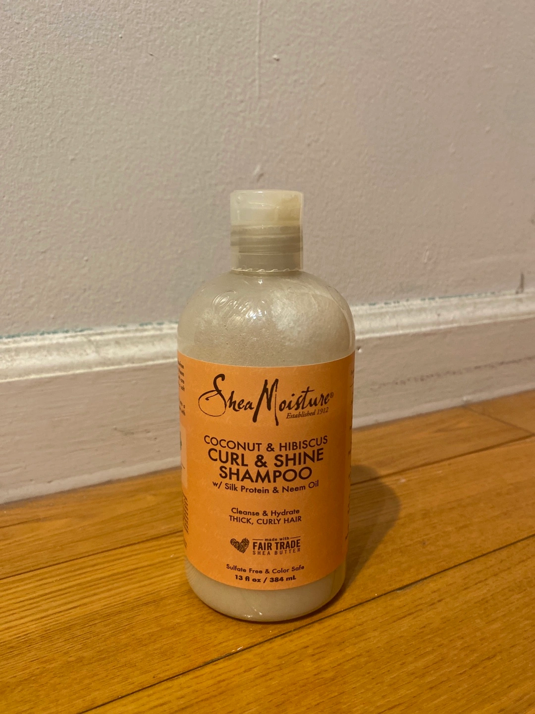 13 fl oz bottle of SheaMoisture Coconut & Hibiscus Curl & Shine Shampoo. Cleanses and hydrates thick, curly hair. Made with fair trade Shea butter. Sulfate free and color safe. More than half left.
