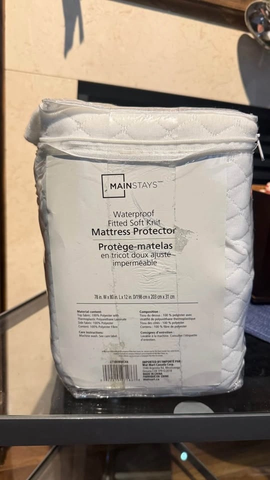 King size waterproof fitted mattress protector — new/unused. The packaging was opened and resealed (see photos), but the protector inside has never been used. Pickup in Stouffville.
