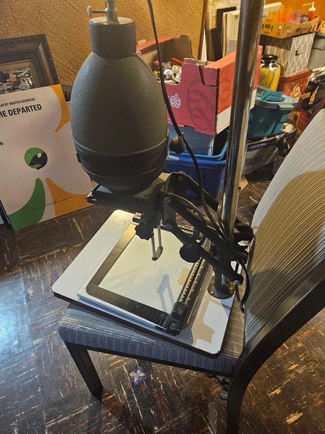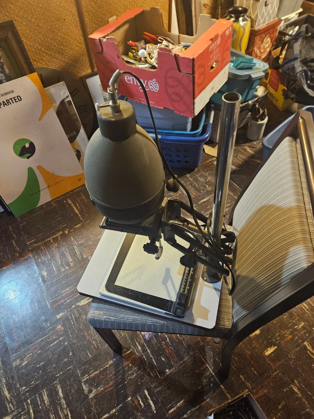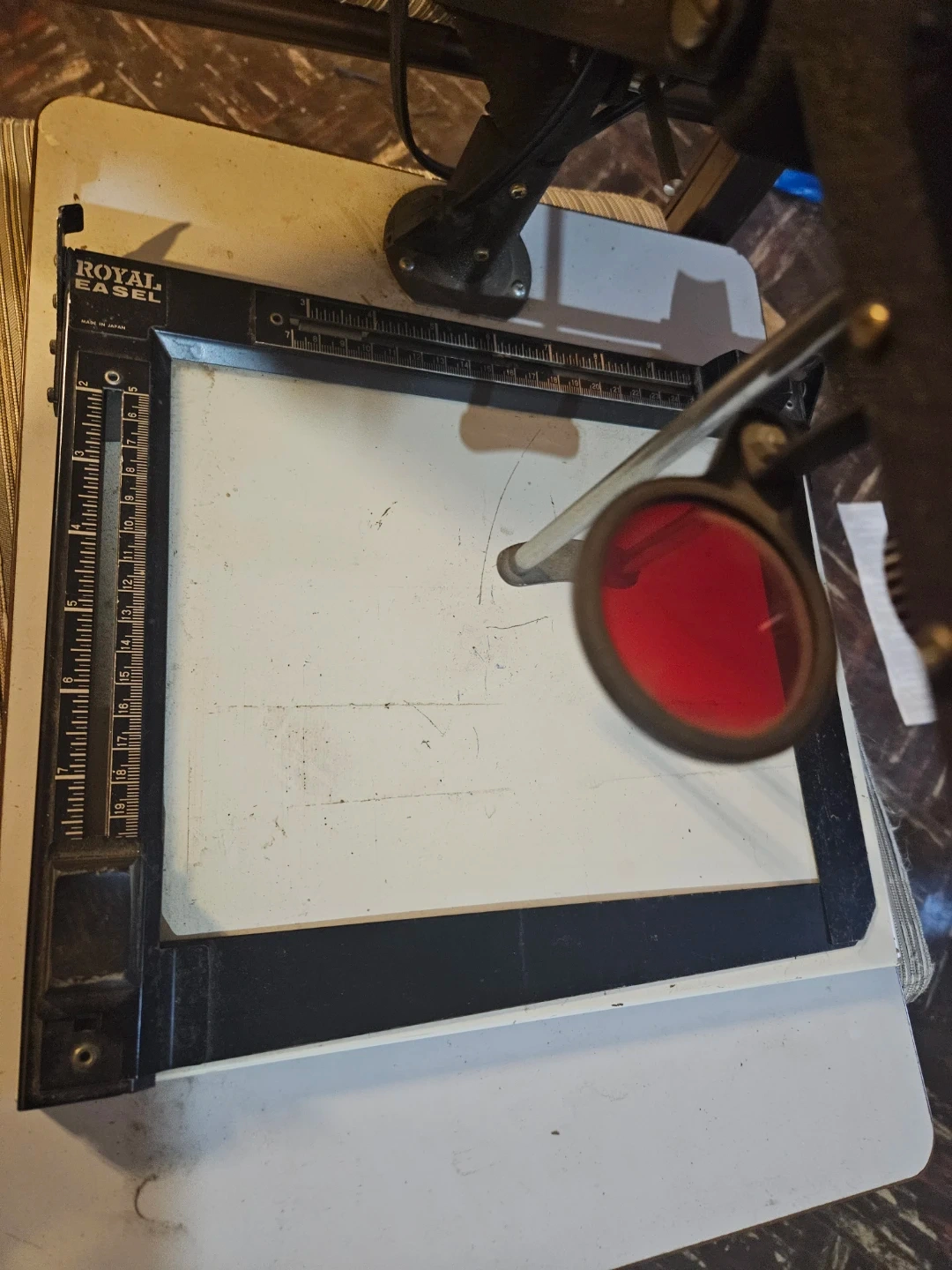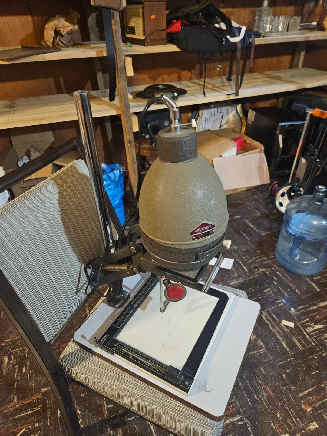 Astron enlarger for darkroom printing. Includes Royal Basel easel with measurement guides. This setup is for black and white photographic printing. Perfect for amateur or professional darkroom use!