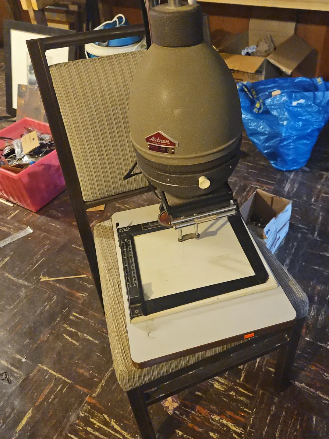 Astron enlarger for darkroom printing. Includes Royal Basel easel with measurement guides. This setup is for black and white photographic printing. Perfect for amateur or professional darkroom use!