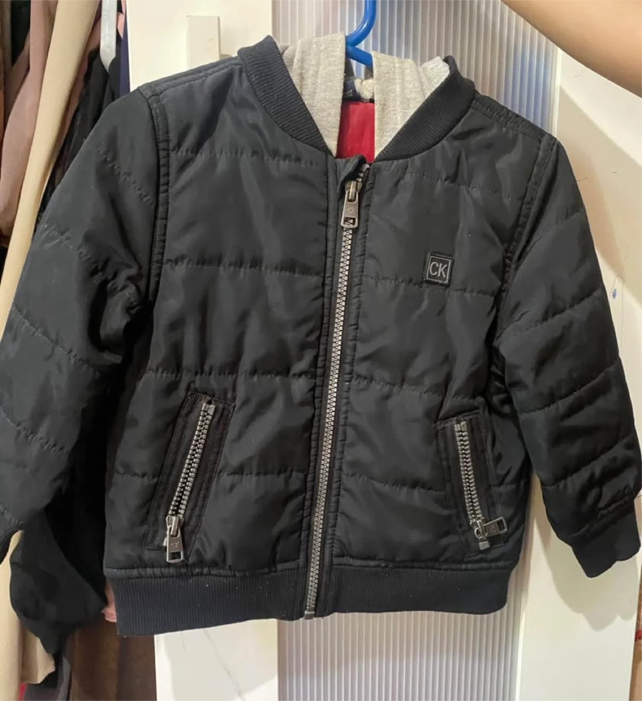 Here's a Calvin Klein kids' puffer jacket in black! It's in great condition and perfect for keeping your little one warm. The jacket features a quilted design and the classic CK logo.