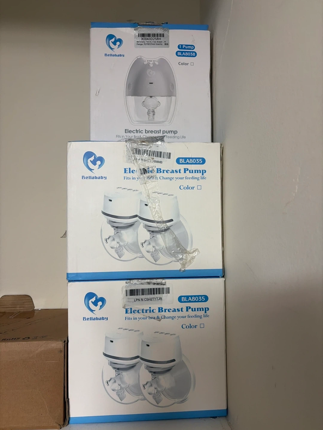 Bellababy electric breast pump in original packaging. Model BLA8035 fits in your bra for hands-free use. Includes flange inserts.