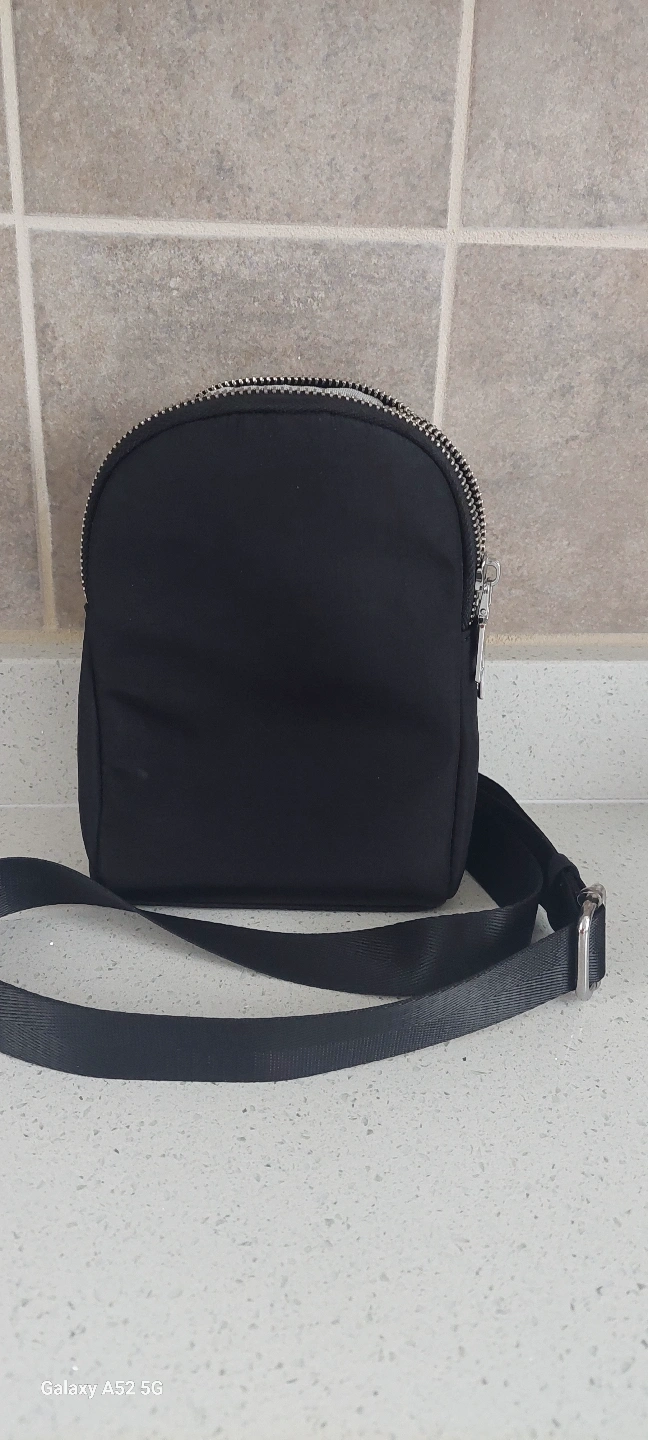Small black bag. Features two zippered compartments and an adjustable crossbody strap. Ideal for everyday use.