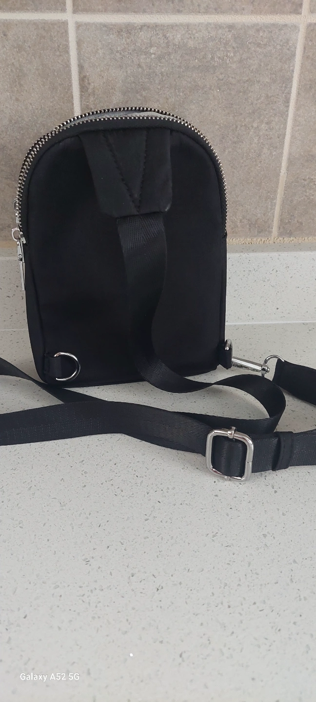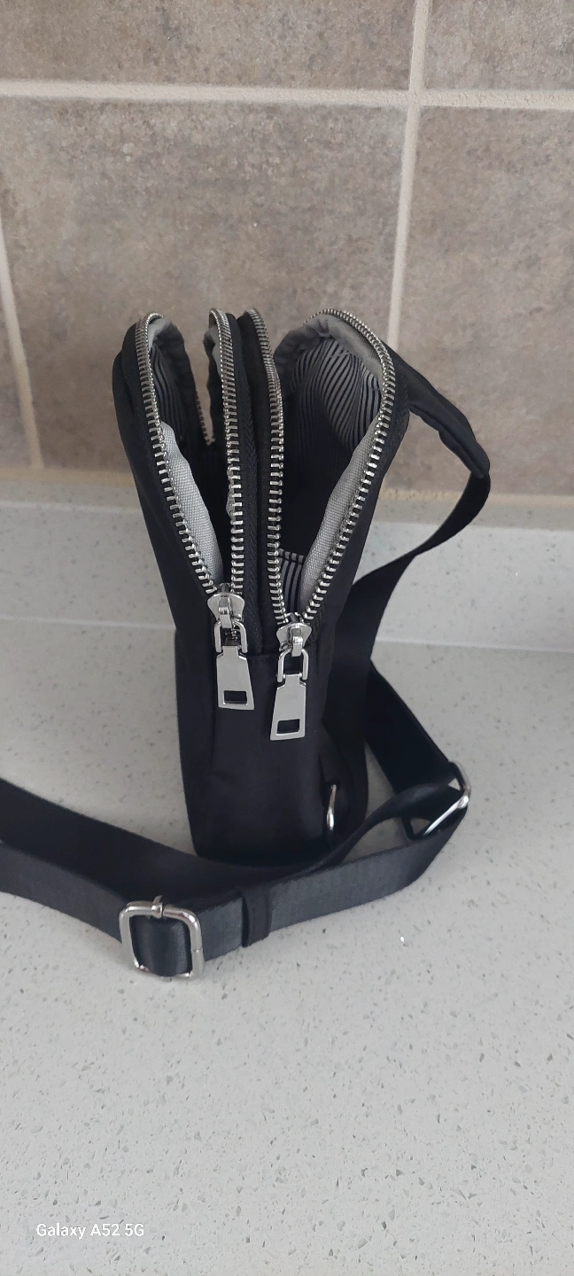 Small black bag. Features two zippered compartments and an adjustable crossbody strap. Ideal for everyday use.