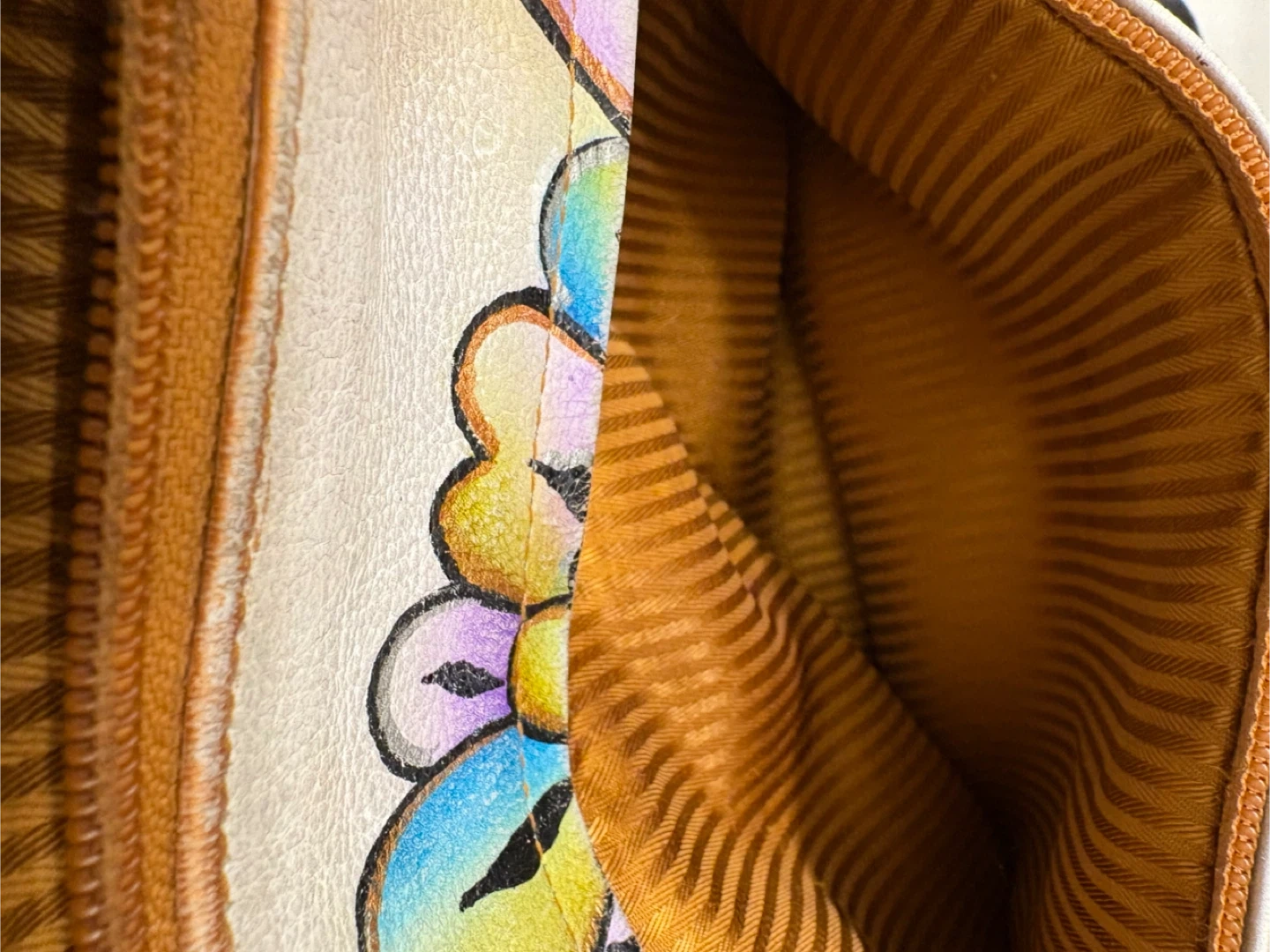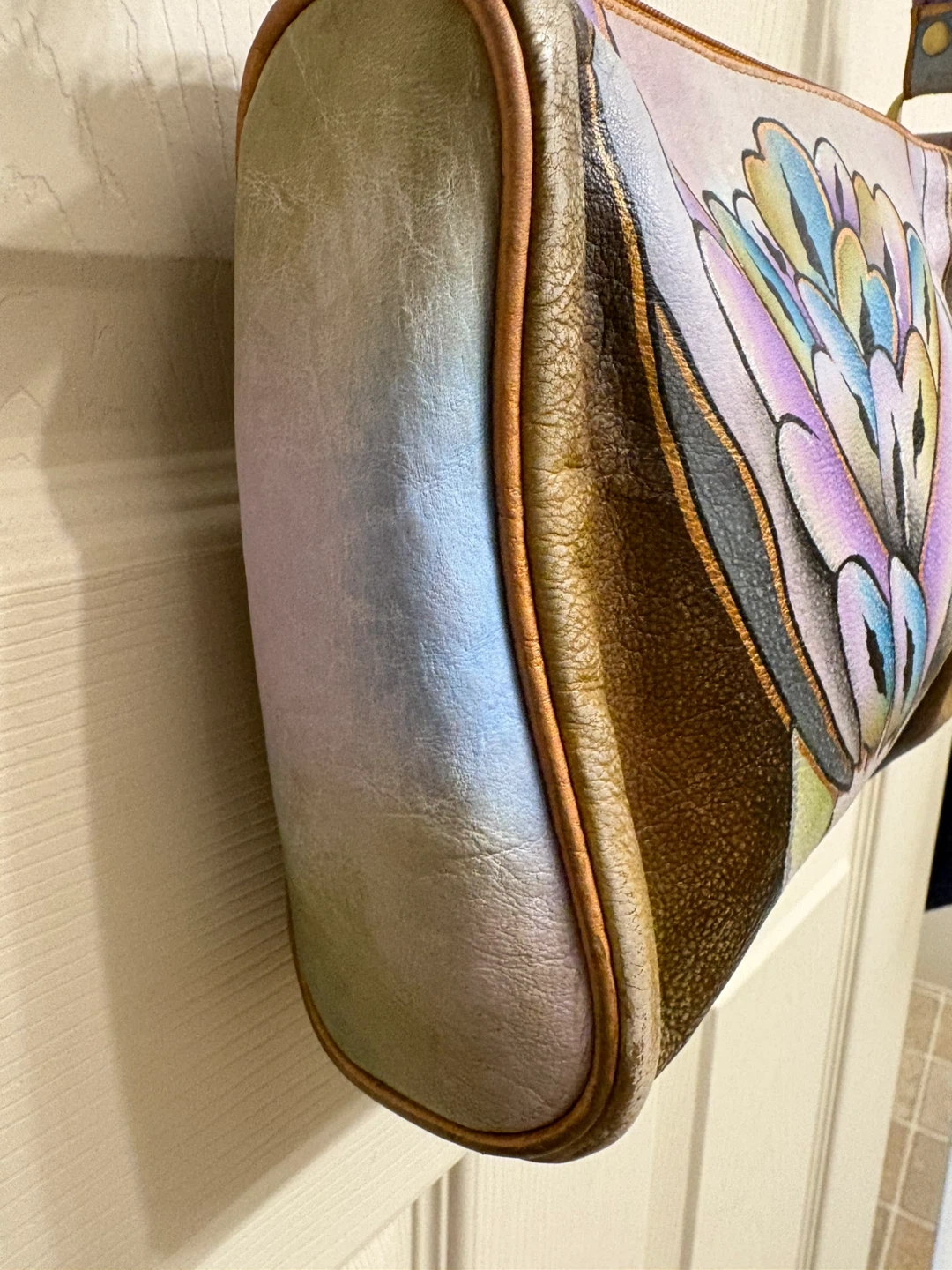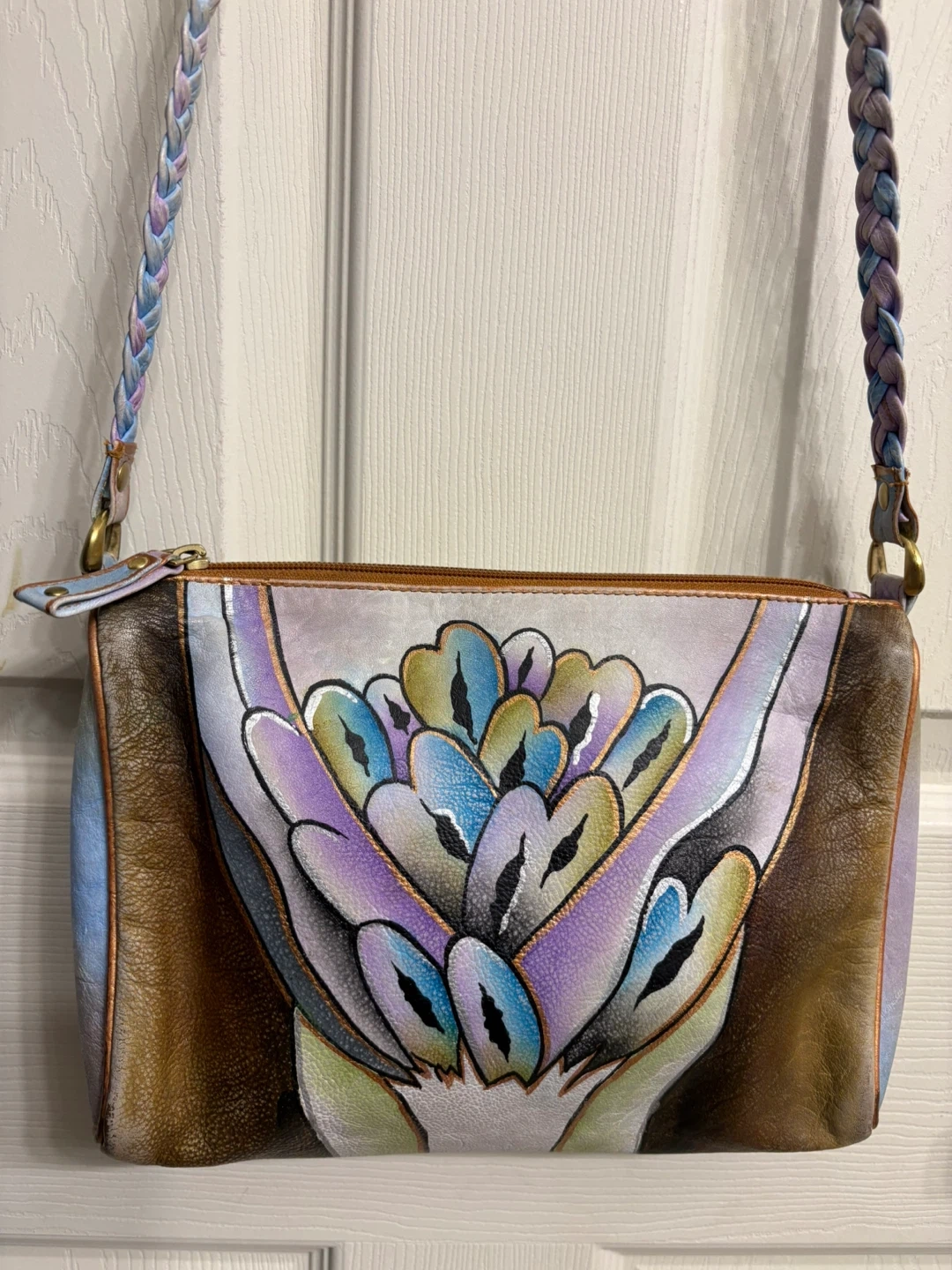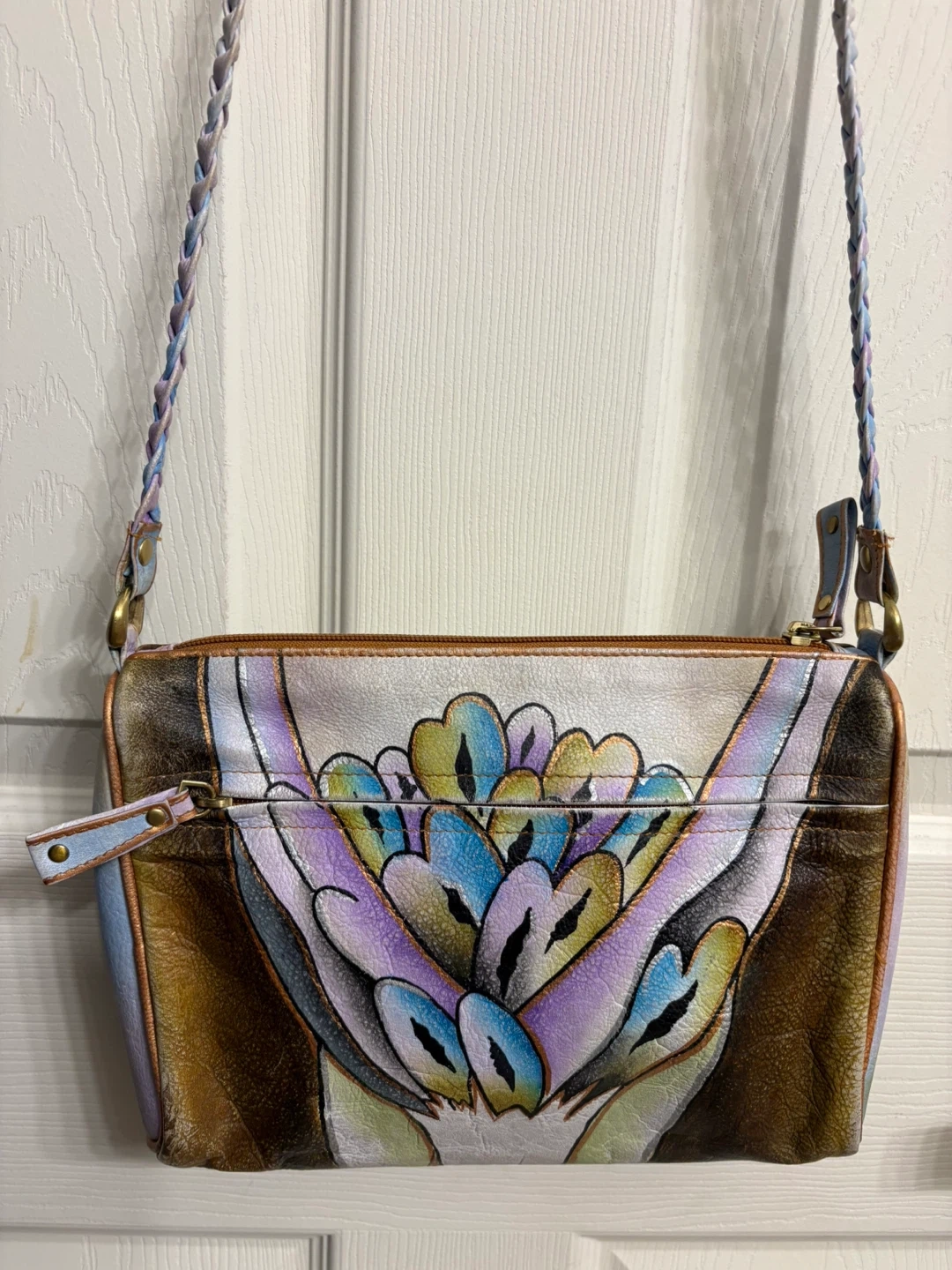 Elevate your style with this artistic hand painted leather shoulder bag, featuring a stunning multicolor design. The strap on this bag is a braid with 3 different colours, unique! Perfect for adding a classy touch to any outfit.