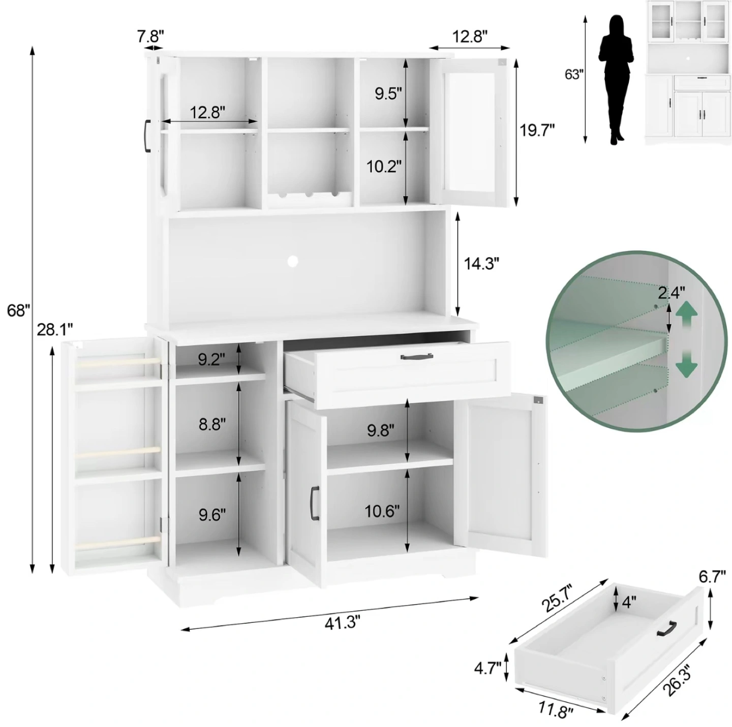Brand new unboxed, white kitchen hutch cabinet with glass doors. It's in great condition and ready to add some storage and style to your kitchen or dining area. Key features include: - Glass doors on the upper cabinets - A drawer for utensils or linens - Lower cabinets for storing larger items Dimensions are shown in the images.