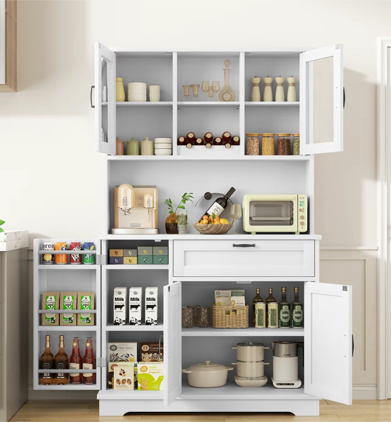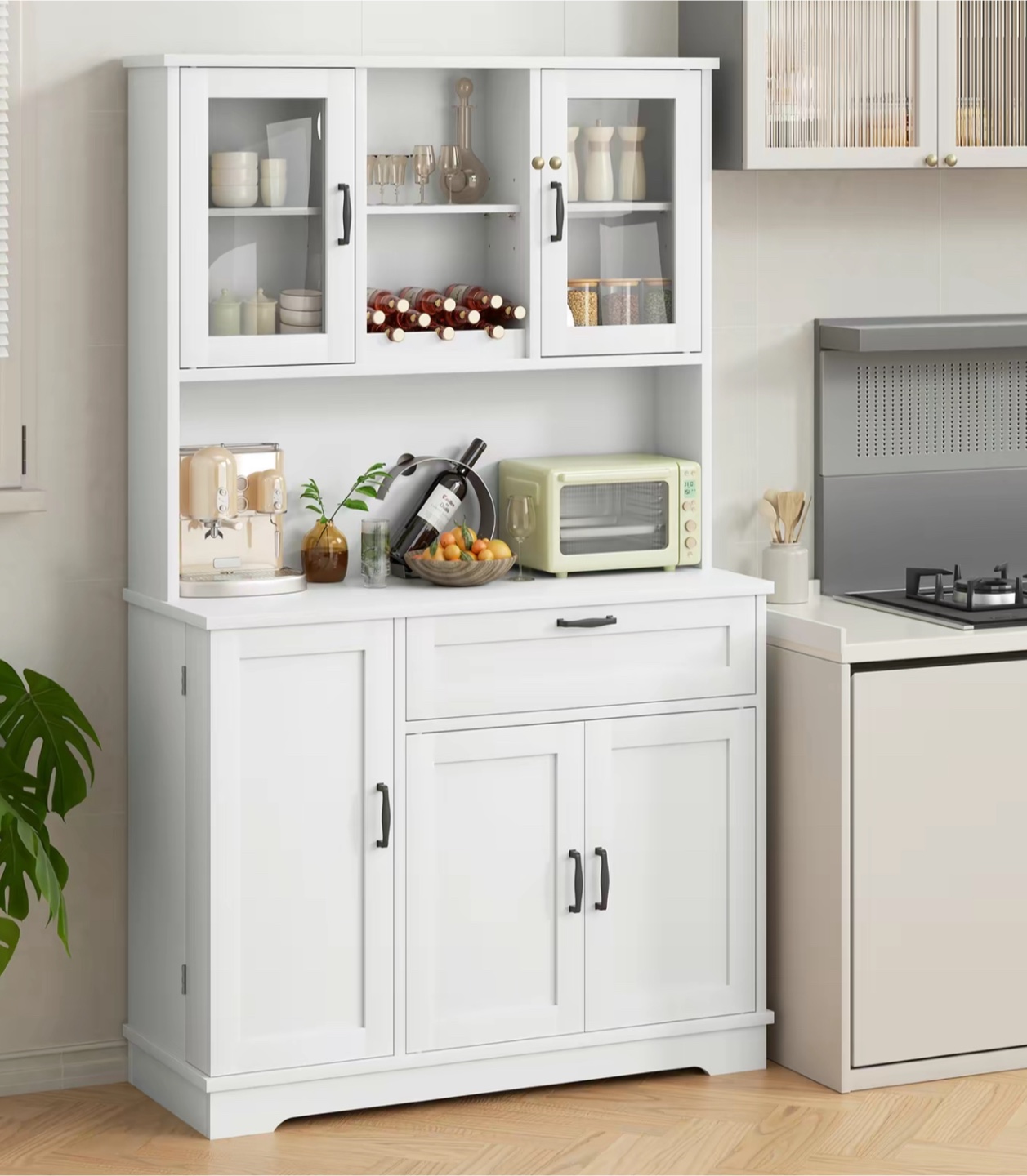 White Kitchen Hutch Cabinet with Glass Doors