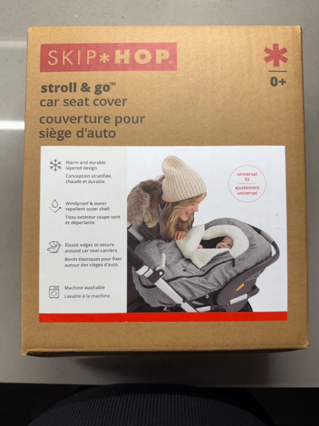This Skip*Hop Stroll & Go car seat cover is designed for universal fit. It's warm and durable with a windproof and water-repellent outer shell. Elastic edges secure it around car seats, and it's machine washable.