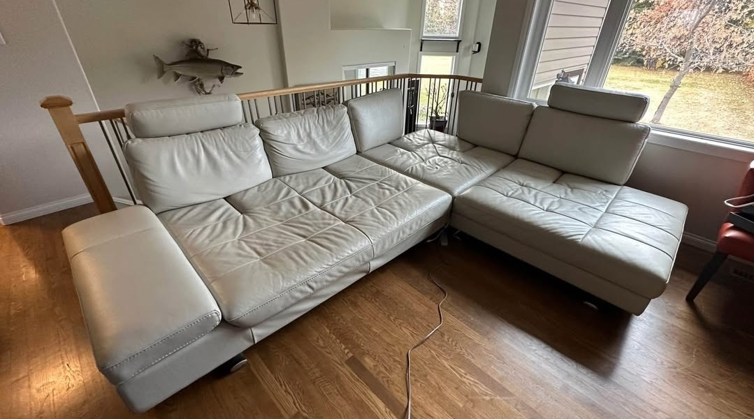 Looking to sell this comfy leather sectional sofa! It's in great condition and would be a perfect addition to any living room. The neutral colour will fit with any decor, and the sectional design offers plenty of seating for family and friends