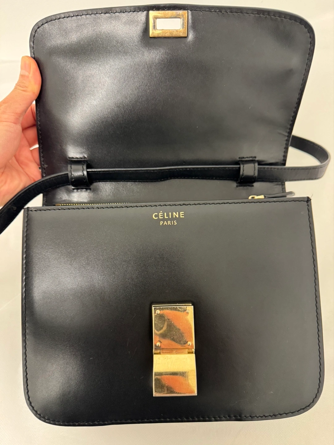 Black leather crossbody bag. Features gold-toned hardware. Adjustable strap. Zip closure. Interior pockets. Excellent for everyday use.