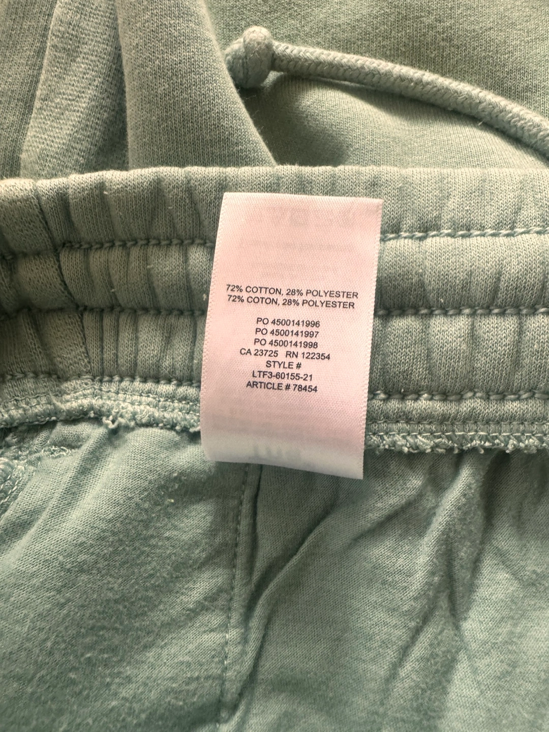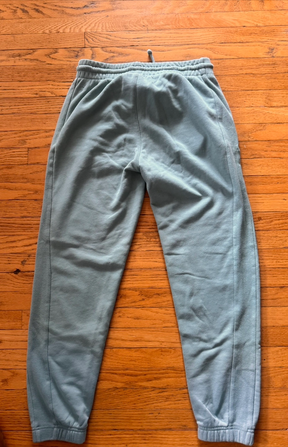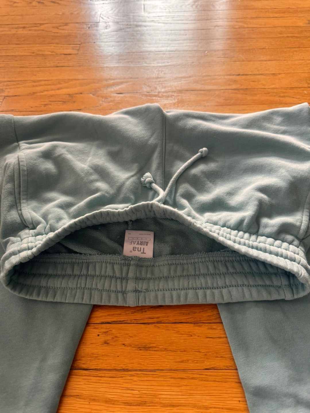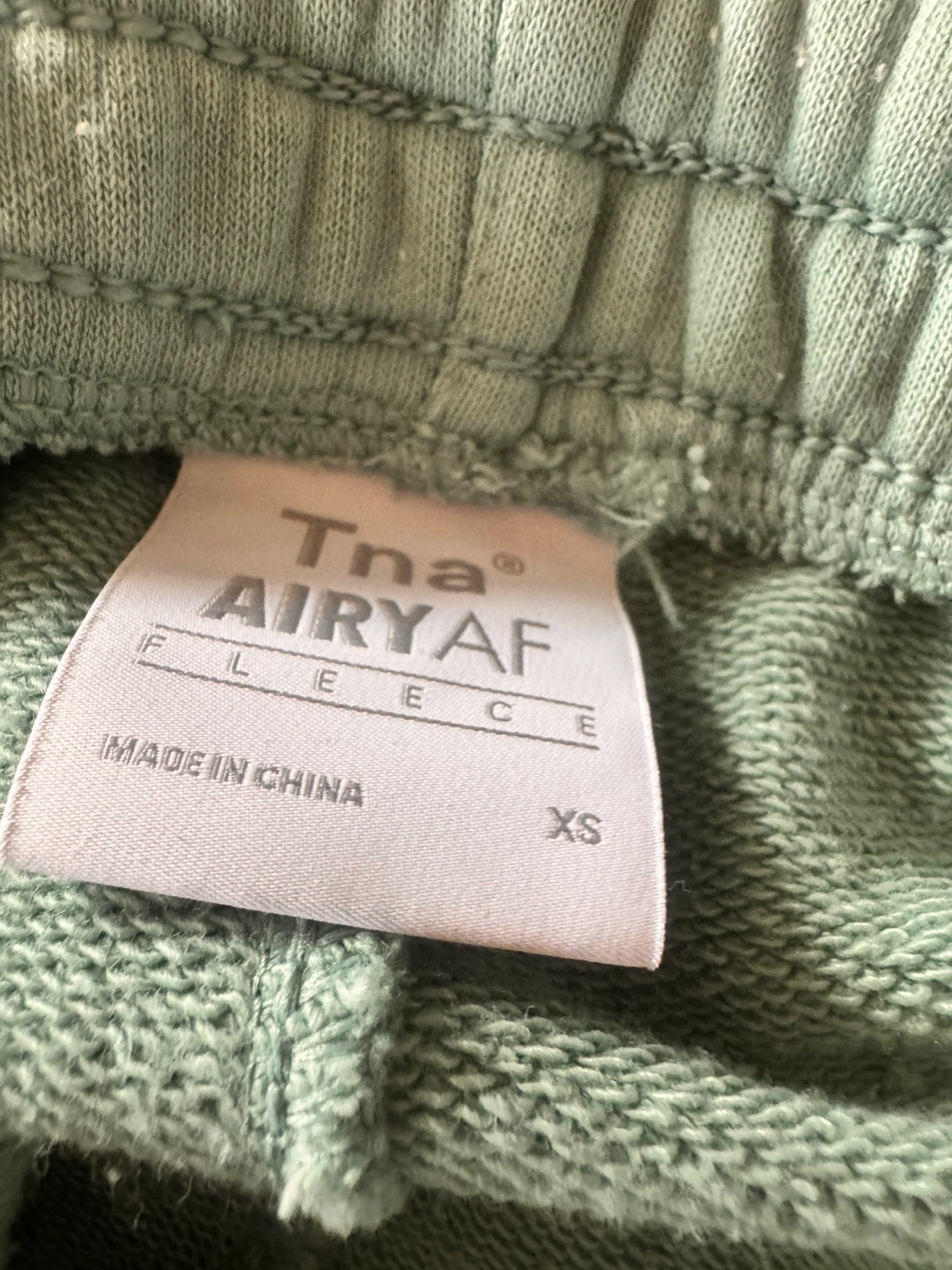 Light teal blue Tna AiryAf fleece joggers. Size extra small. Made in China. 72% cotton, 28% polyester. Drawstring waistband.