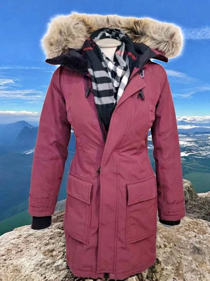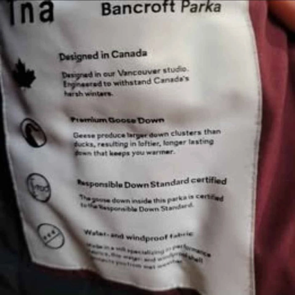 This parka is engineered to provide warmth in temperatures as low as -30°C and is filled with 100% responsibly sourced goose down. I bought it at Aritzia, Yorkdale, for $400. The faux fur on the hood has never been used. This jacket is still in great condition and comes from a pet-free and non-smoking home. Size XS (Woman's or 14 to 16 old). This version of the Bancroft is made with waterproof and windproof fabric and has breathable lamination on the backside to keep you comfortable and dry. It's finished with merino-wool blend cuffs and boasts smart technical features. Filling is 80% Goose Down and 20% Goose Feathers. The coat features a flattering elasticated waistband for a streamlined fit, large patch pockets, and merino wool cuffs for added warmth. It includes a snorkel hood with a removable Real Faux Fur trim to keep the cold air out. It's a burgundy TNA Bancroft from Aritzia designed for warmth in cold temperatures.