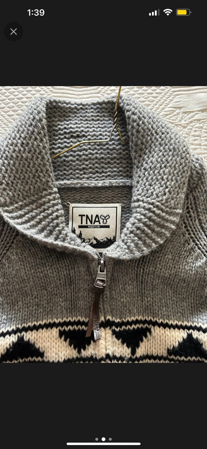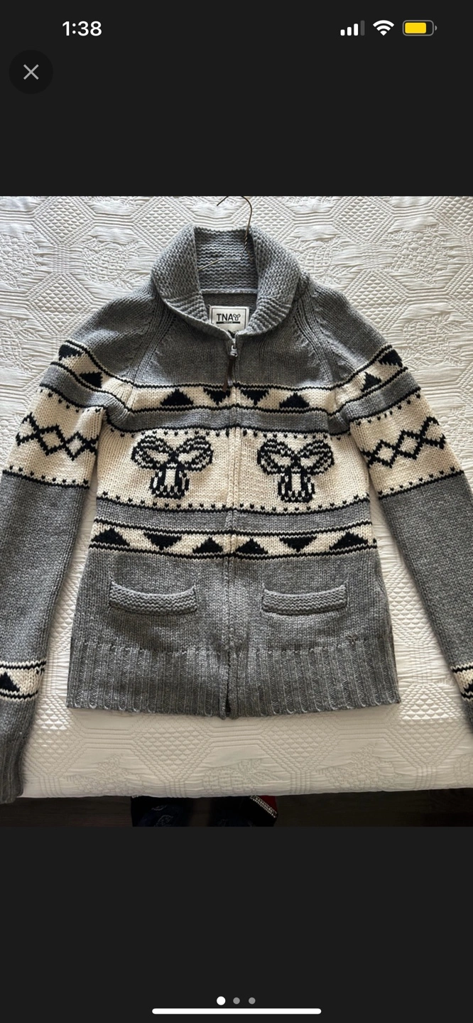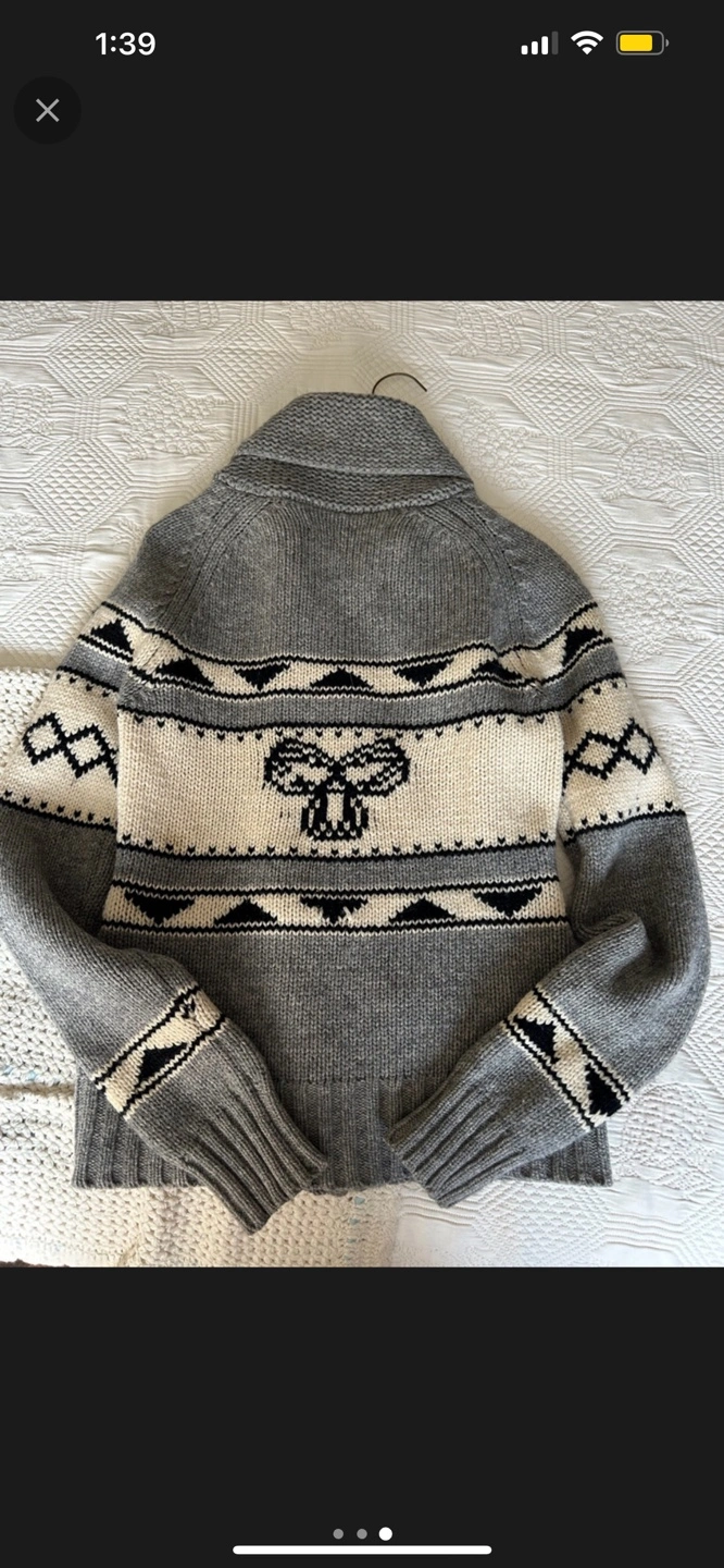 Grey, white, and black sweater with a zipper and a small embroidered skull on the back. It has a cable knit design on the collar and pockets on both sides. Size Medium, but fits like a S/M. 100% lambswool and very warm. Cash only and pick up in Mississauga. All sales final and bundle offers are welcome. A freebie is included with every purchase.