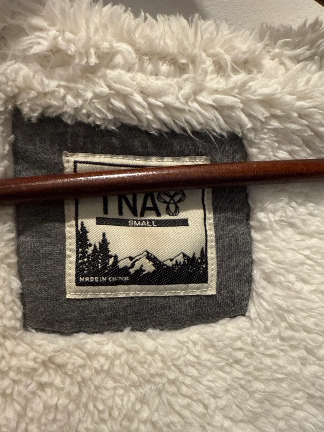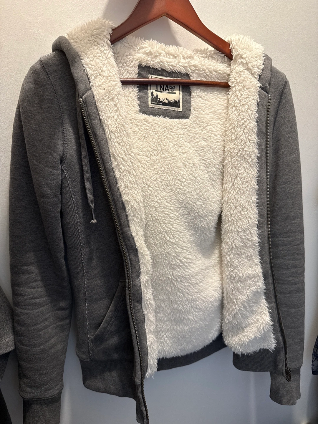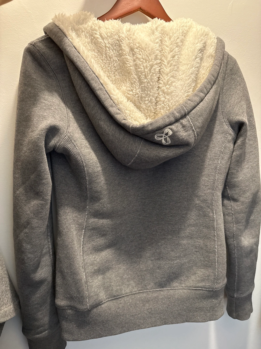 Grey zip-up hoodie. Features a sherpa lining. Small size. Great for colder weather. Excellent condition.