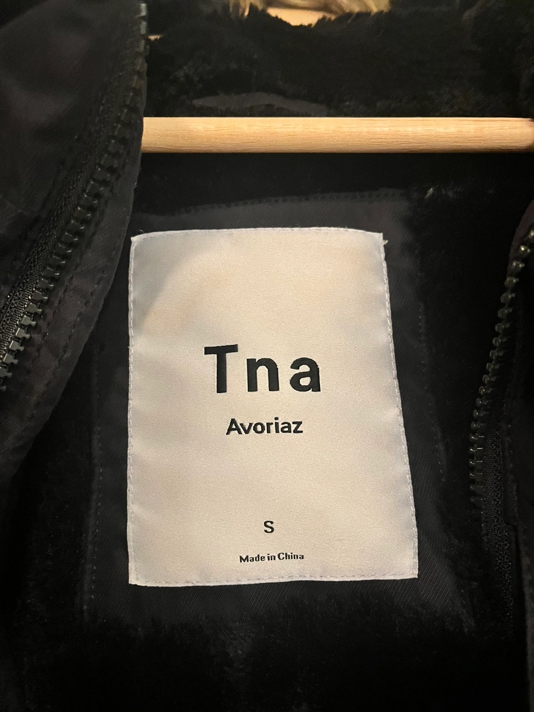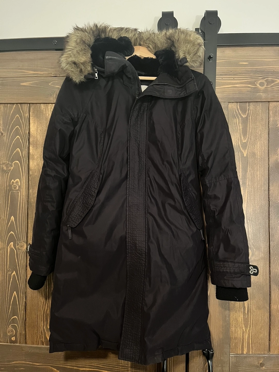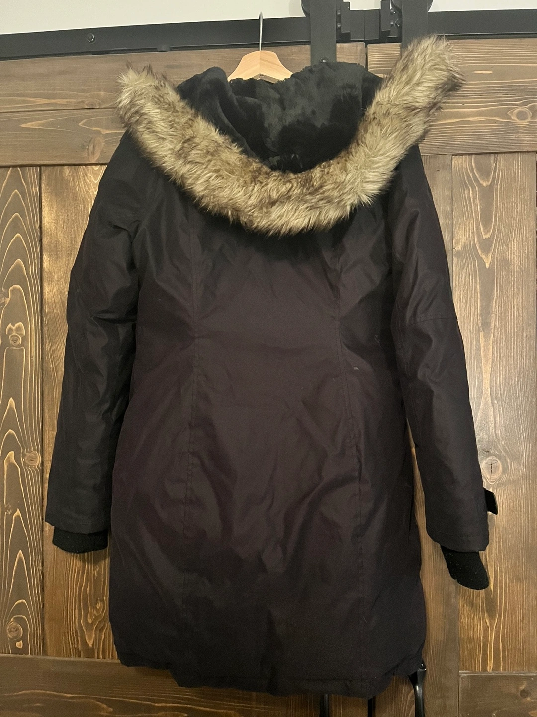 Women's black parka. Size small. Faux fur-trimmed hood. Zipper and magnetic snap closure.
