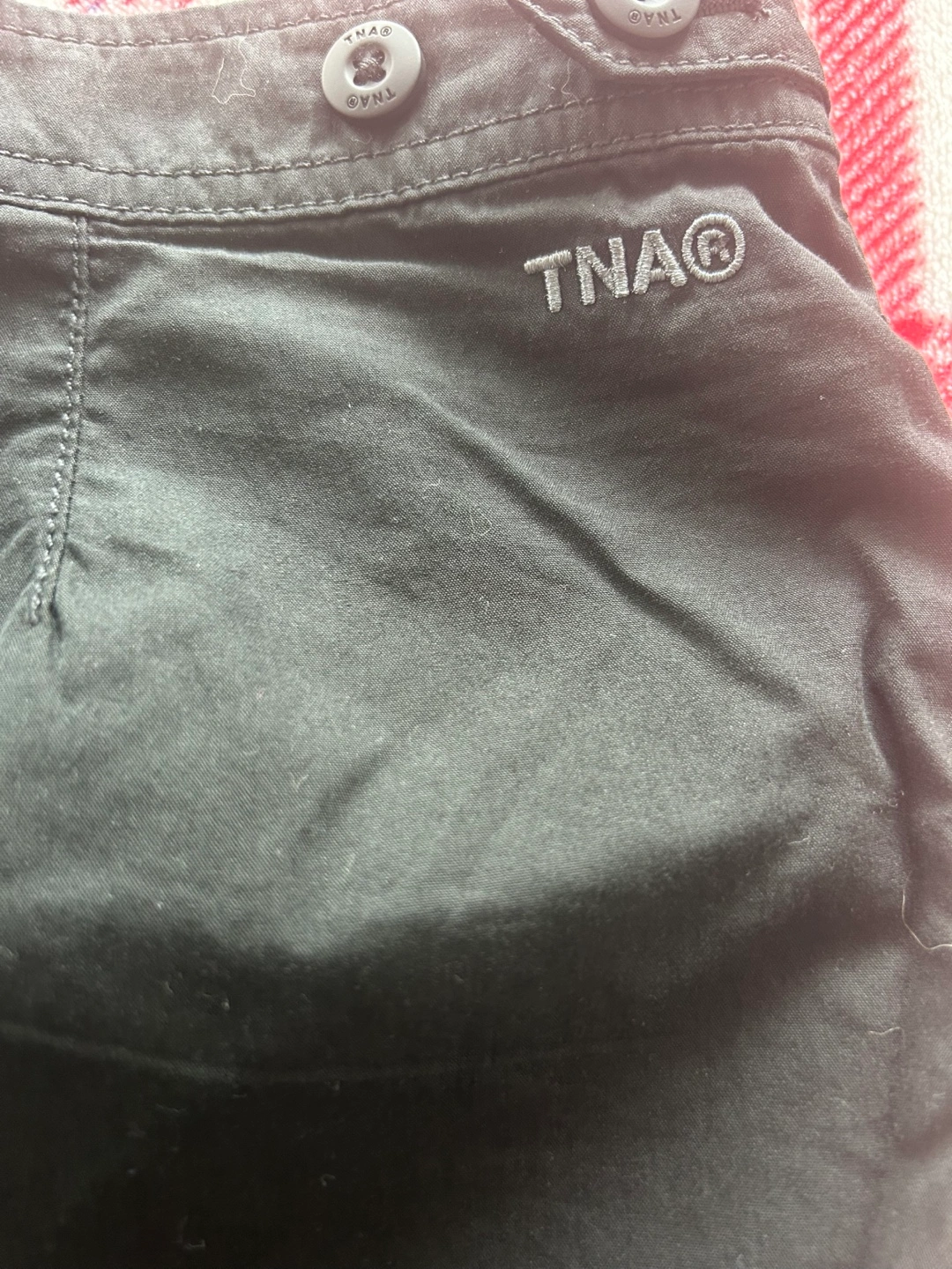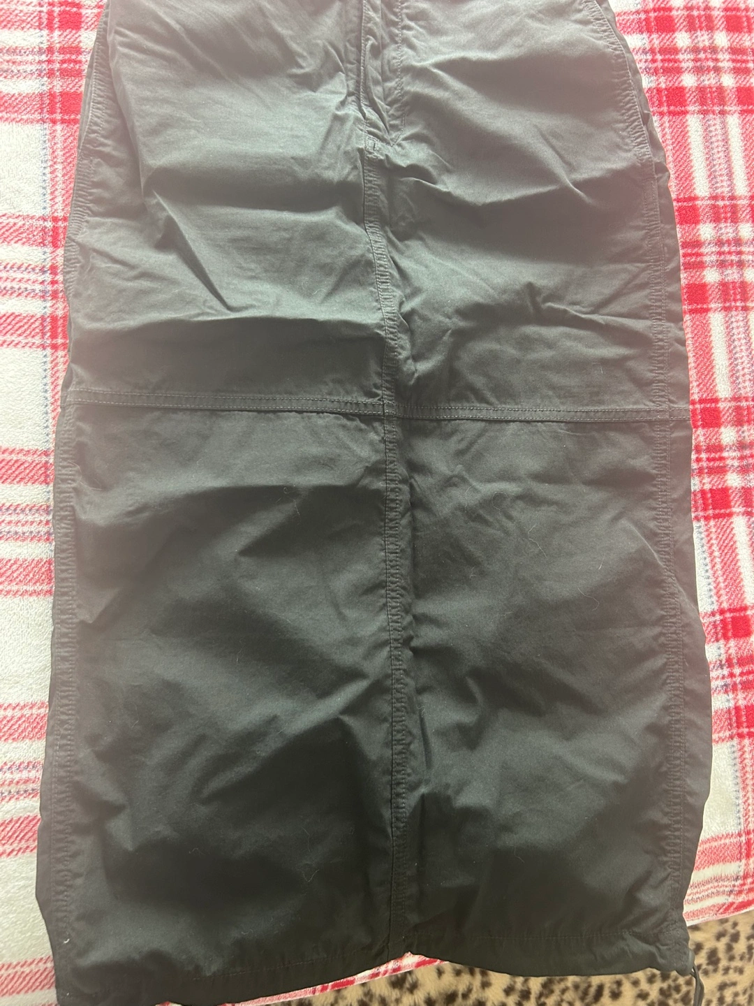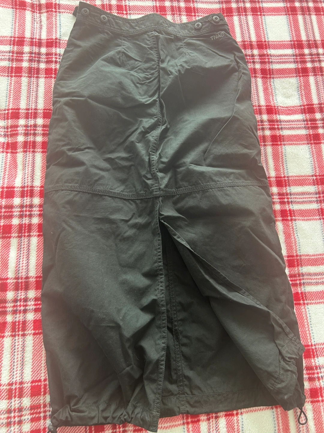 Women's black maxi skirt. Features a front slit and drawstring hem. Button detailing at the waist. Excellent Condition.