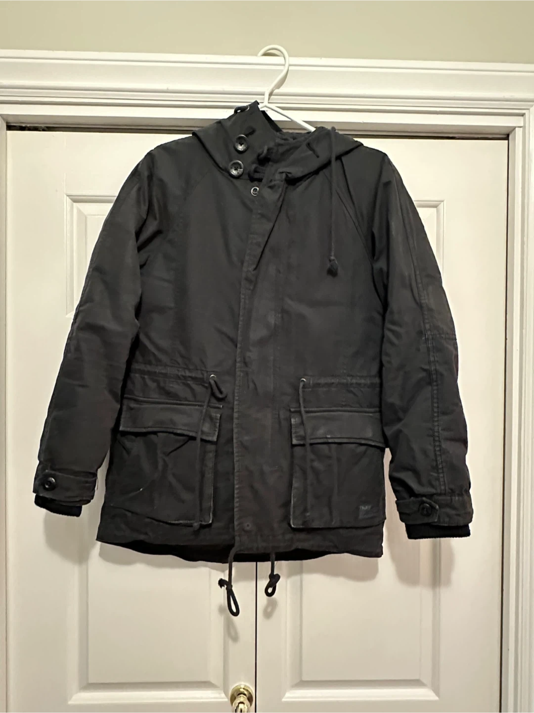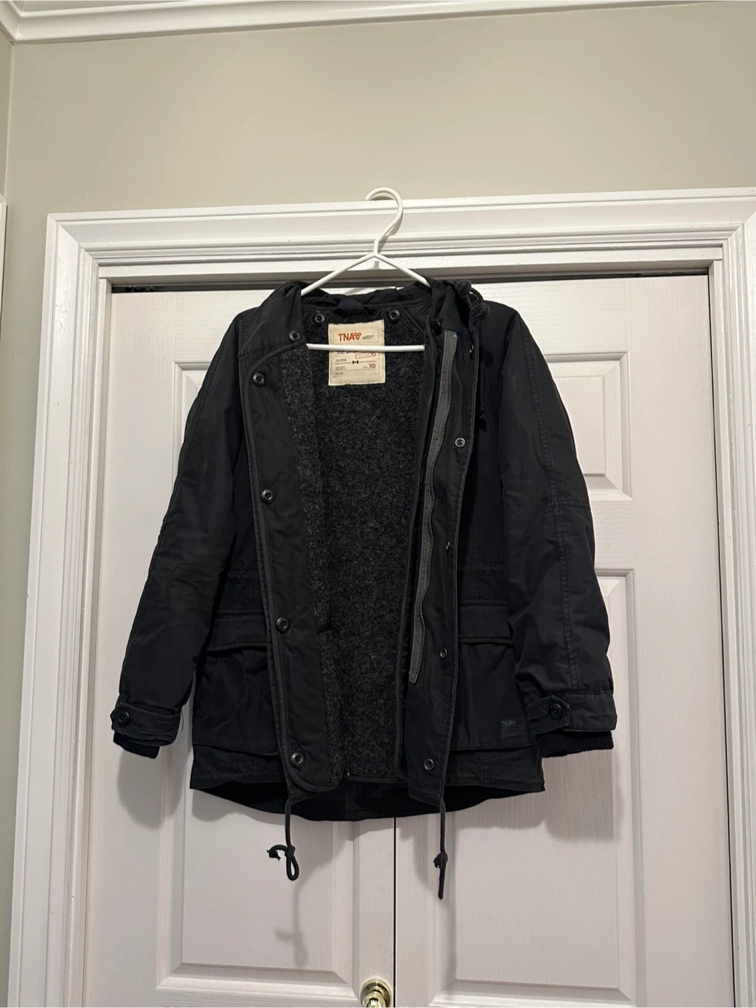 Selling a TNA winter jacket in black, size XS. It's in good condition and perfect for the cold weather! The jacket features a hood and a cozy lining to keep you warm and comfortable. The lining is removable. A stylish and practical addition to your winter wardrobe