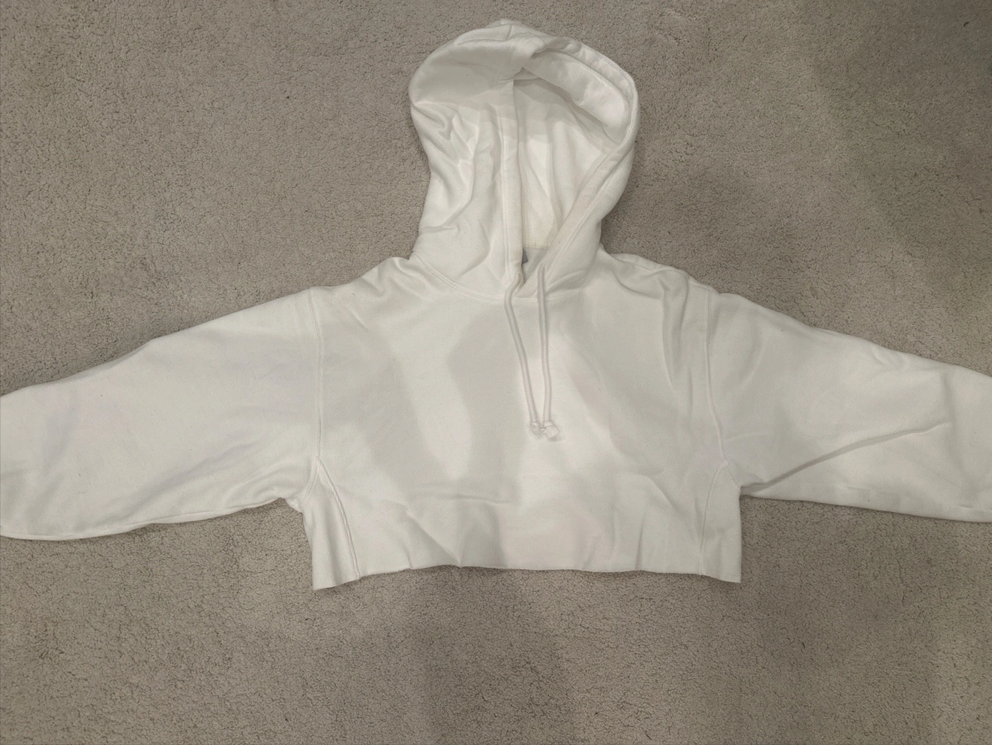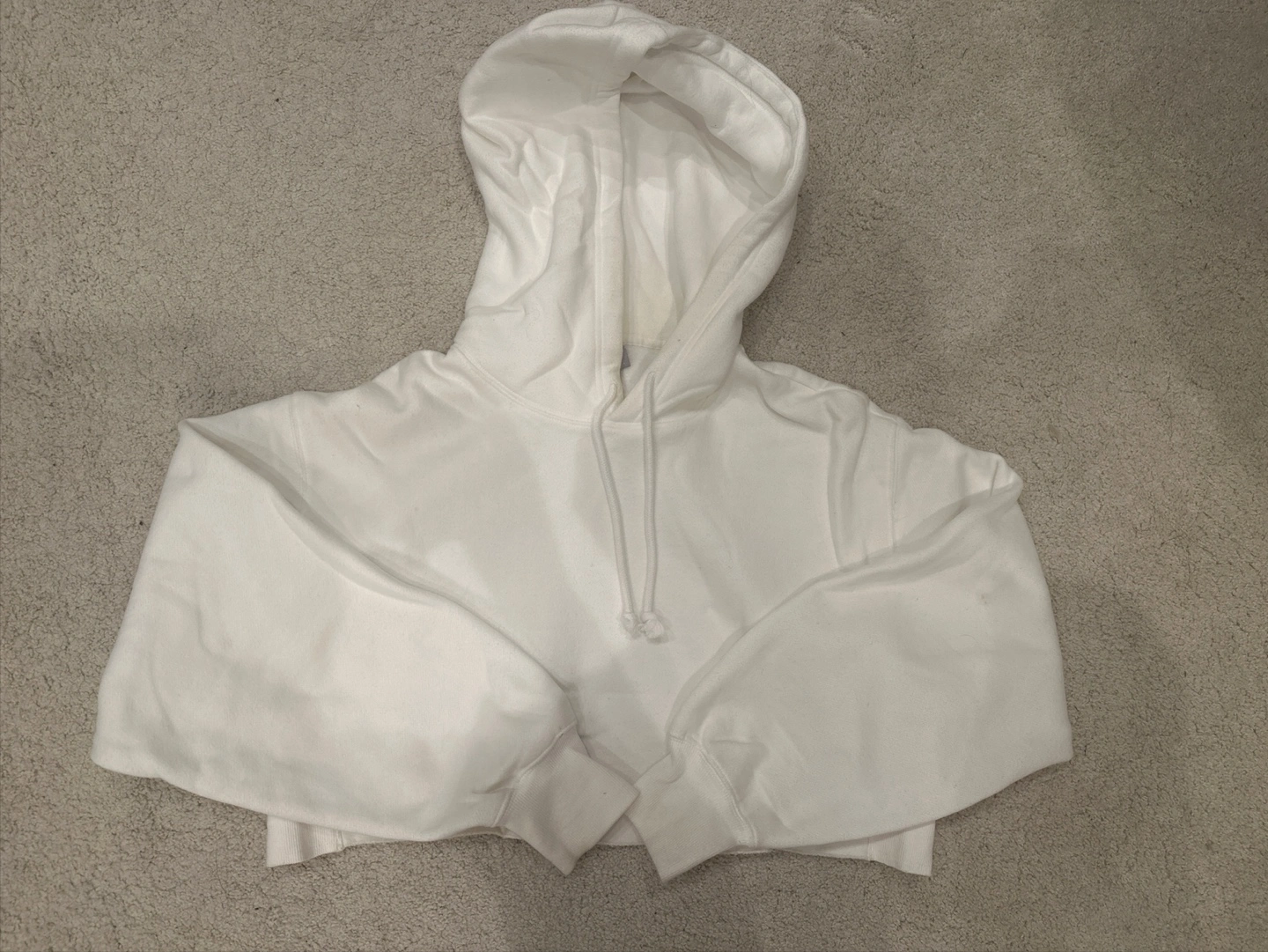White, cropped length. Features long sleeves and a hood with a drawstring. The material is soft and comfy. Perfect for feeling cosy on a relaxing day.