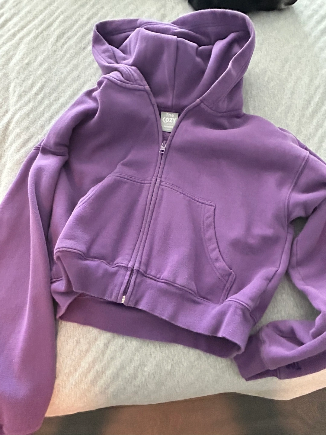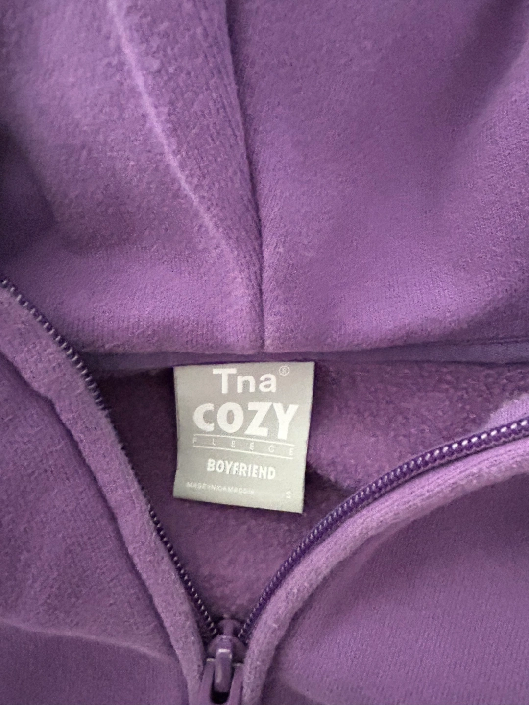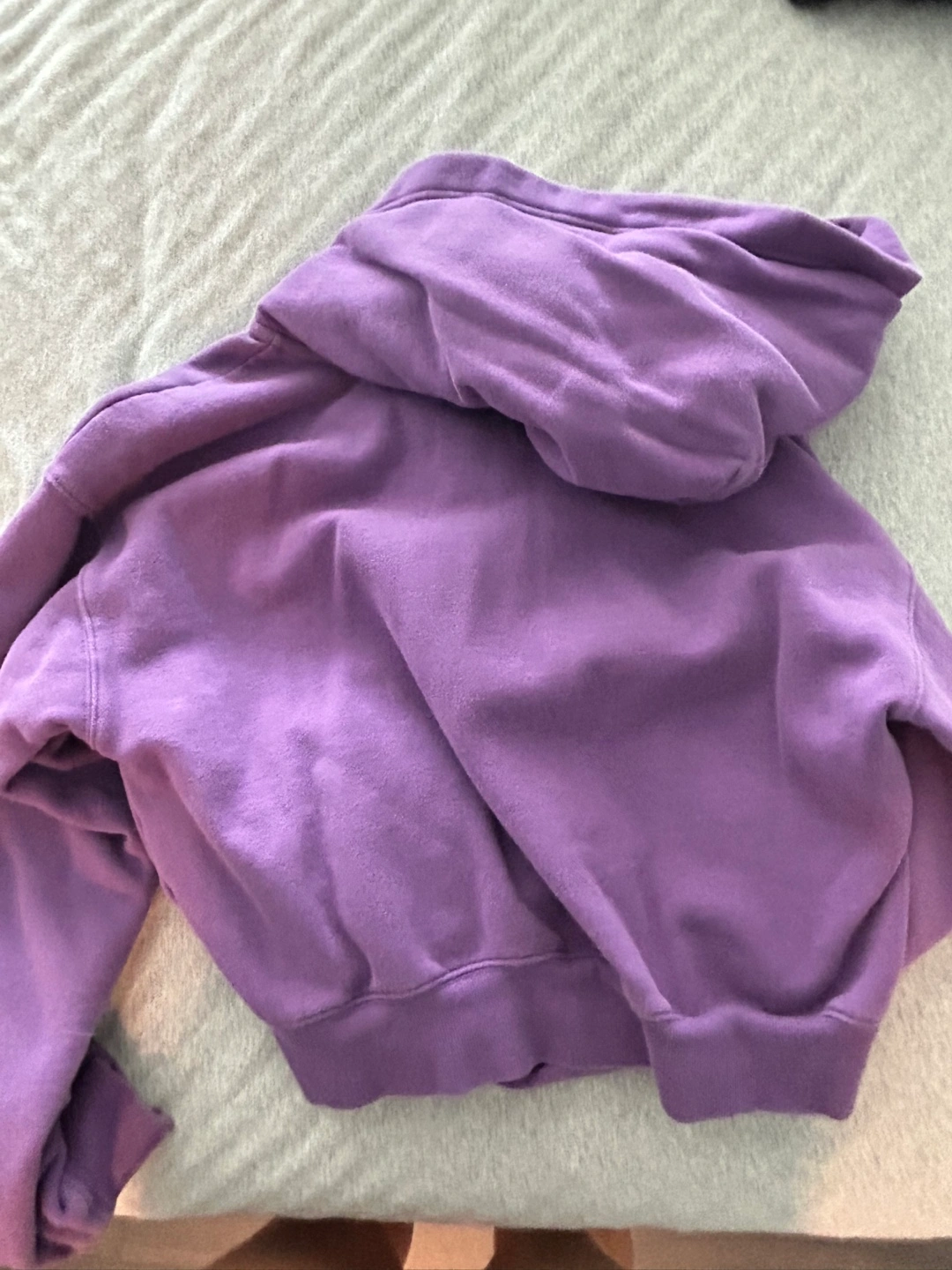 Purple zip-up hoodie. Cozy fleece material. Small size.