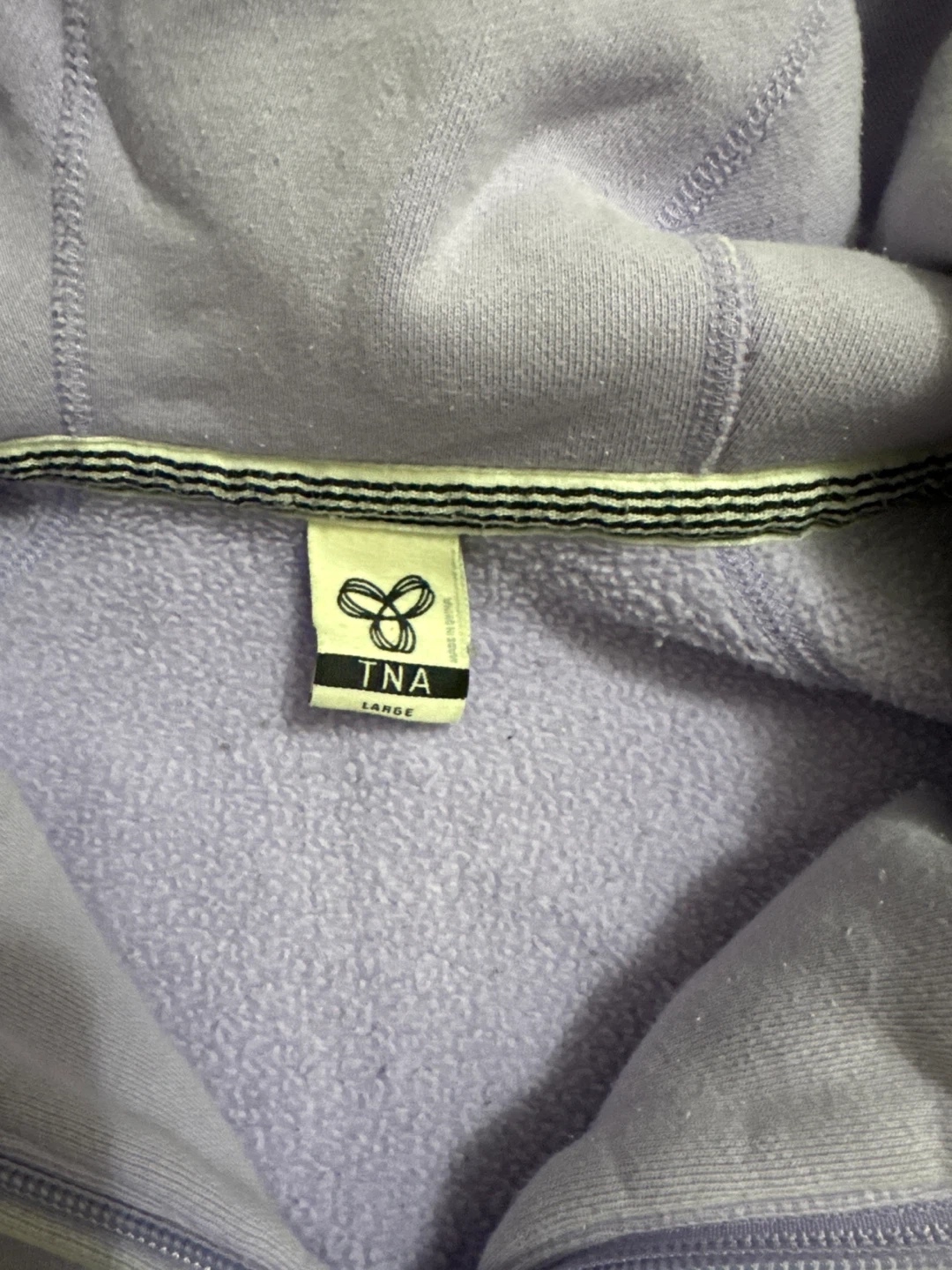 90Selling a TNA full zip hoodie in a lovely lilac colour! It's a size large and in good condition. Perfect for layering or just lounging around the size is large but i think its fit in small to medium womens