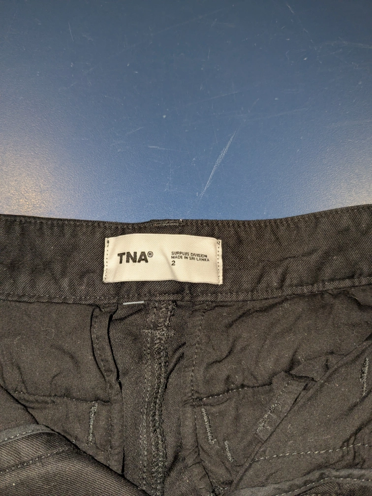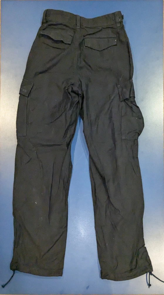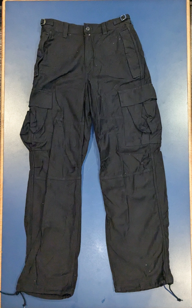 39Black cargo pants. Multiple pockets. Drawstrings at the ankles. Size 2.