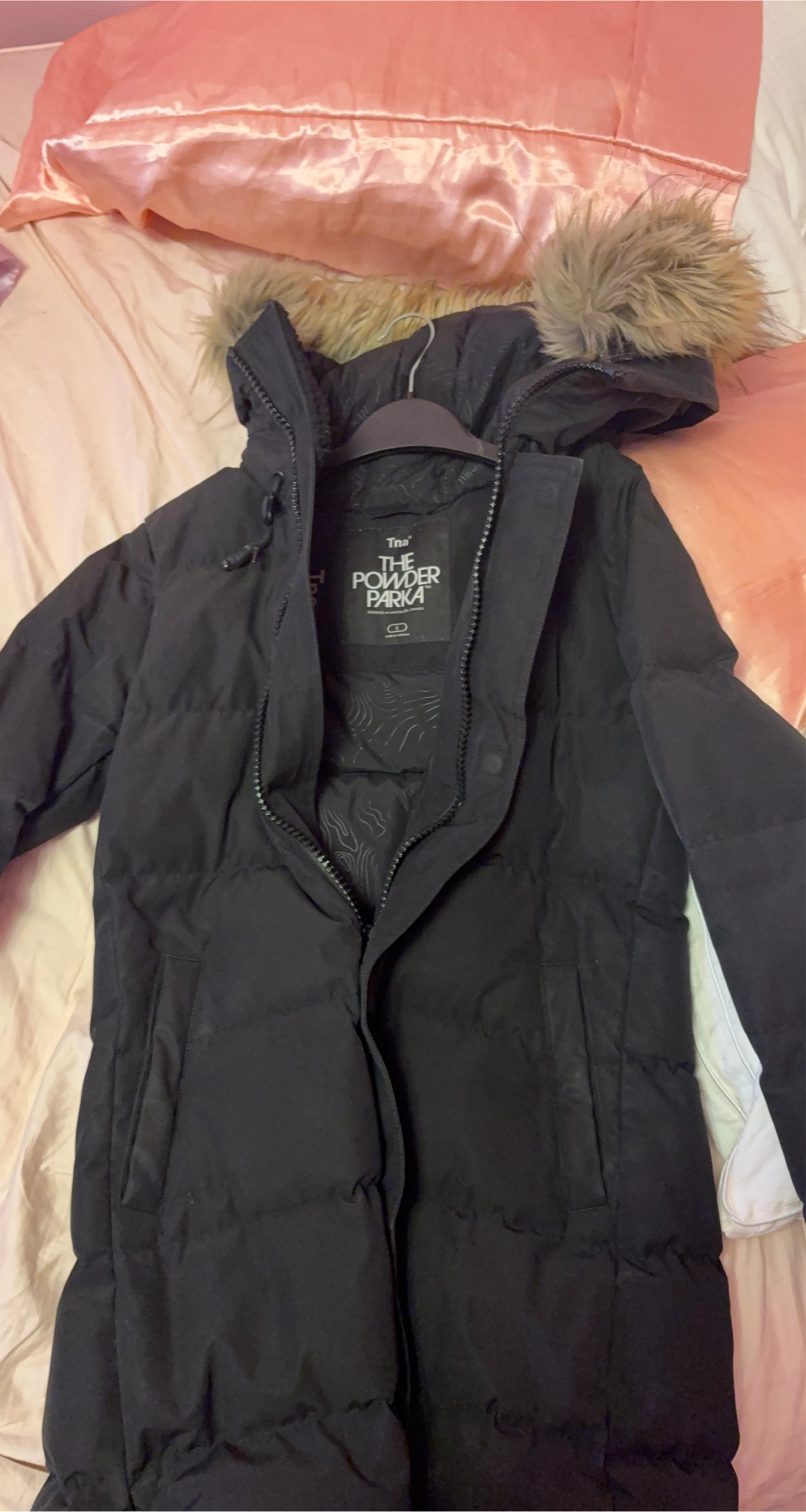 Selling a TNA The Powder Parka in black! It's in great condition and ready to keep you warm this winter. This parka features a faux fur trim on the hood and a sleek design. One of the straps broken I will sell for $90