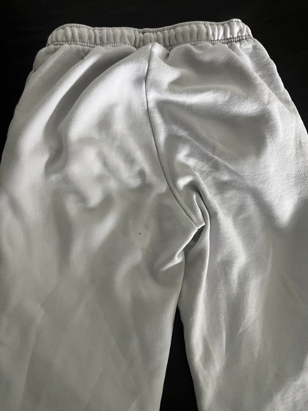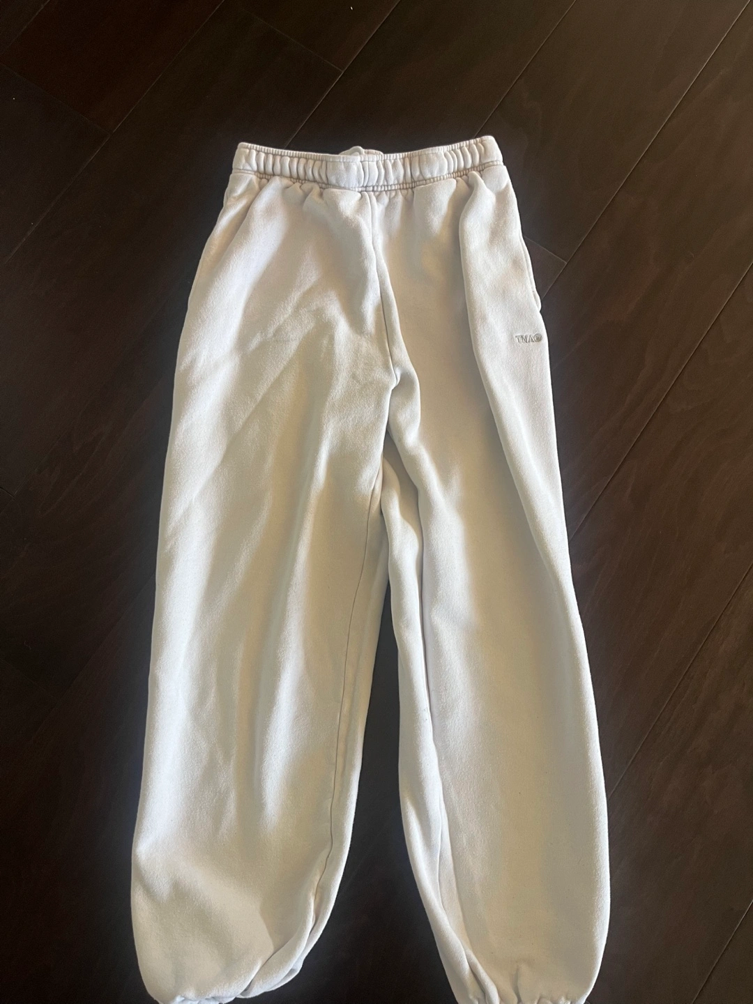 47White sweatpants with an elastic waistband and cuffs. A small TNA logo on the left leg. at the back there’s a small bleach stain not too noticeable