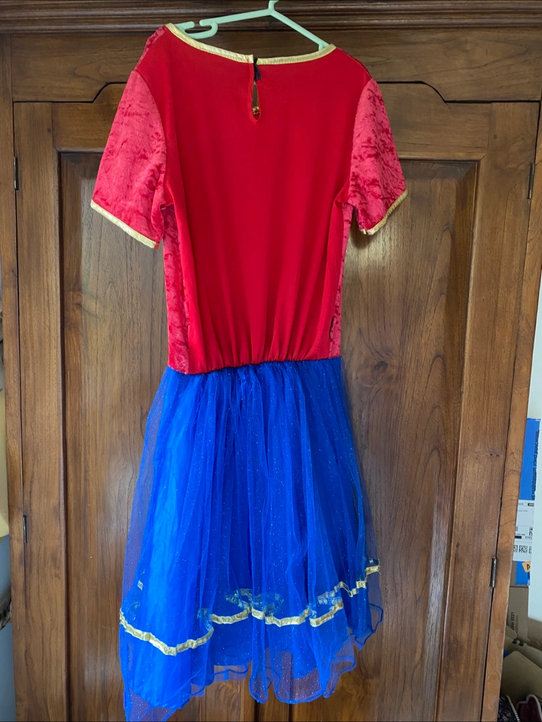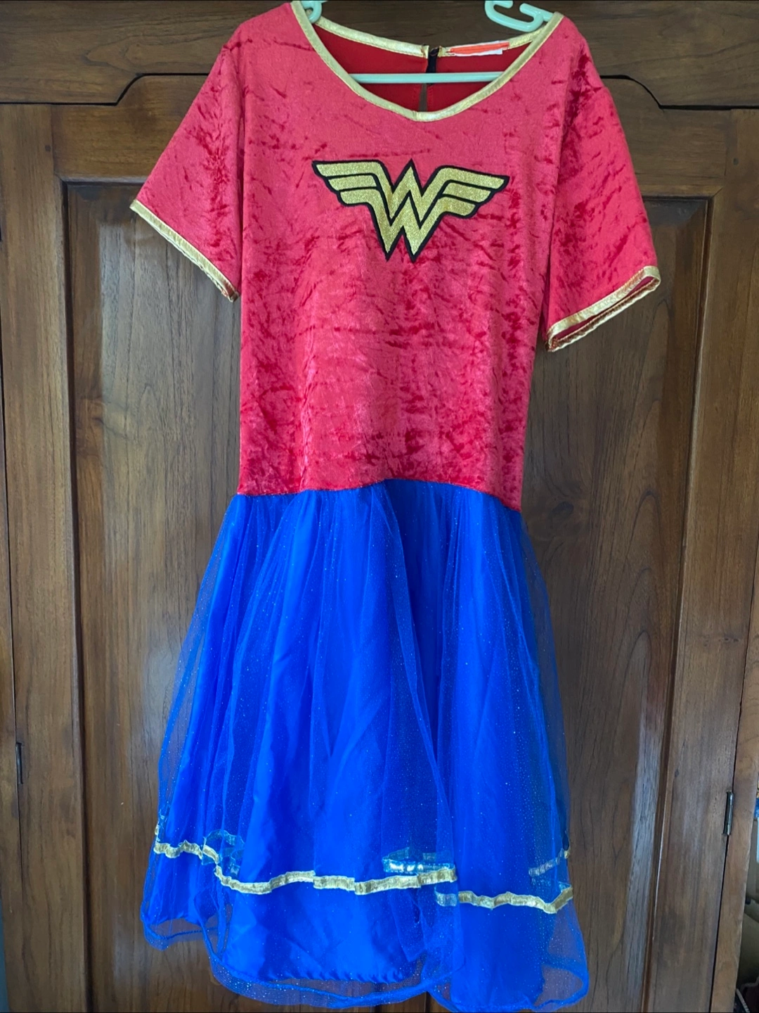 Selling a girls Wonder Woman costume! It features a red top with the Wonder Woman logo and a blue, glittery tulle skirt. A great costume for dress-up or Halloween! In great condition.