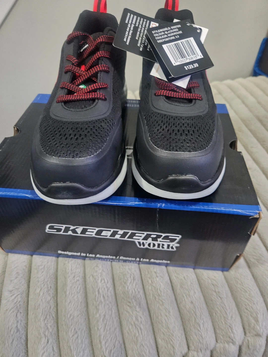 These are Skechers Work men's shoes in black and red. They're a size 9.0. Includes original box and tags. These shoes are designed for work environments.
