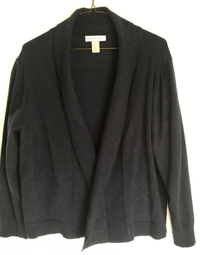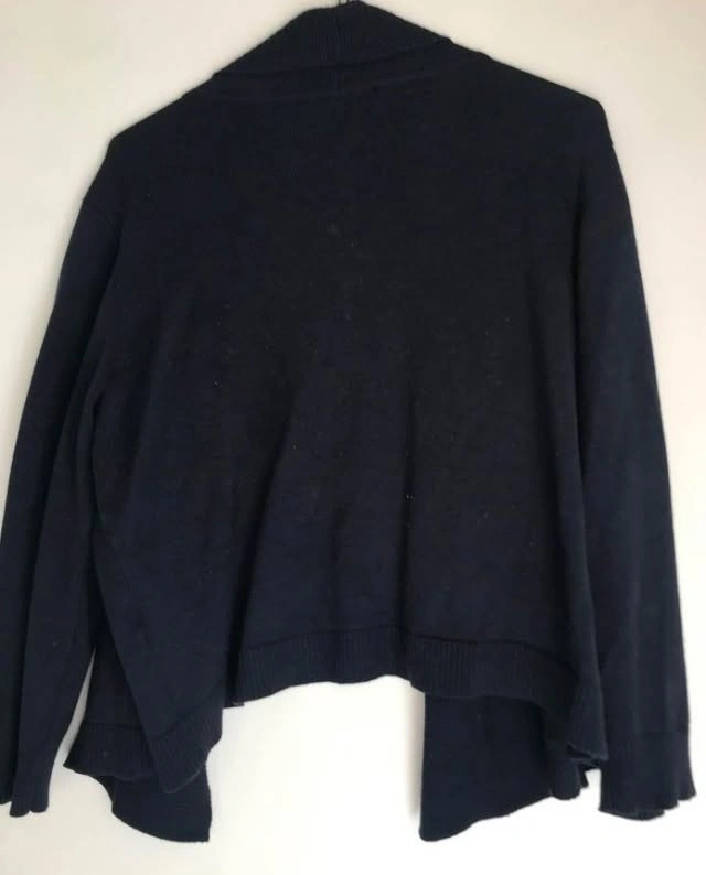 Christopher & Banks large navy women's cardigan in new condition from a pet-free, smoke-free home. No marks, stains, pills, or rips. Rayon/polyester blend fabric, measures 23” long. Let me know if you're interested!