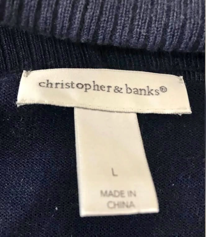 Christopher & Banks large navy women's cardigan in new condition from a pet-free, smoke-free home. No marks, stains, pills, or rips. Rayon/polyester blend fabric, measures 23” long. Let me know if you're interested!