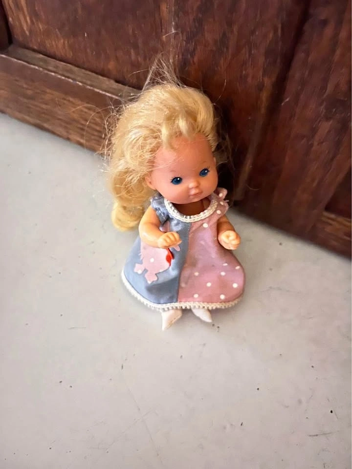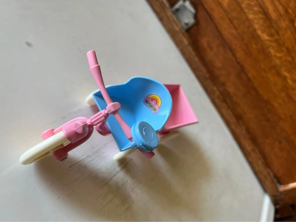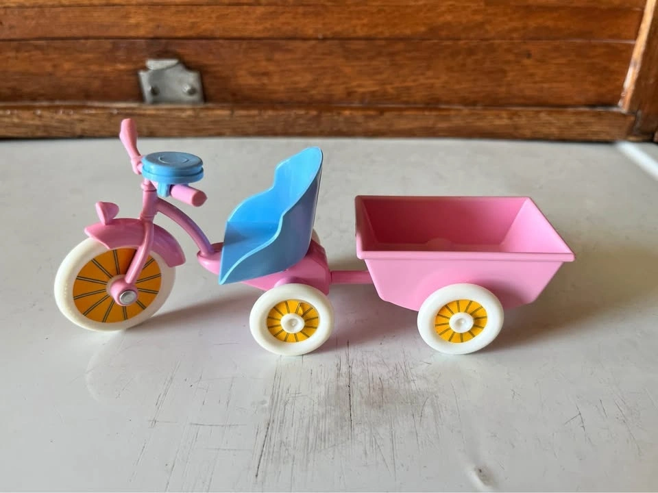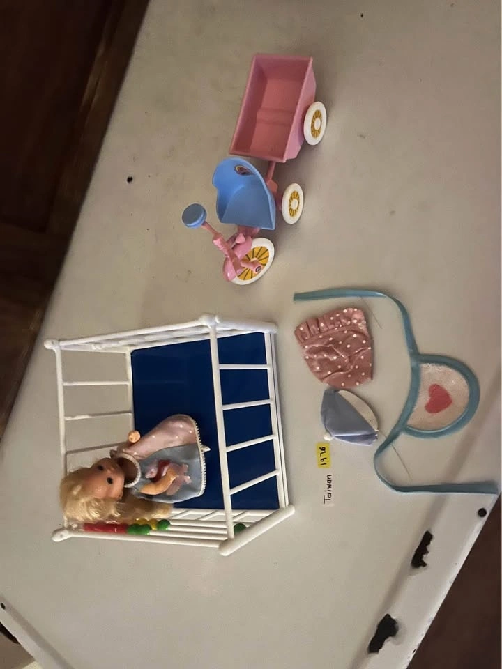 Happy Heart Family toddler baby girl and accessories from 1976. Includes doll, playpen, bike with cart, and clothing. Selling as a set. Pickup and cash only.