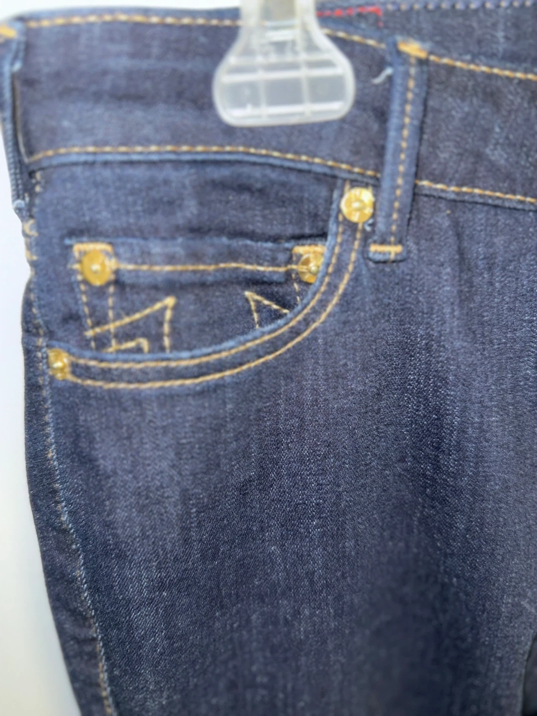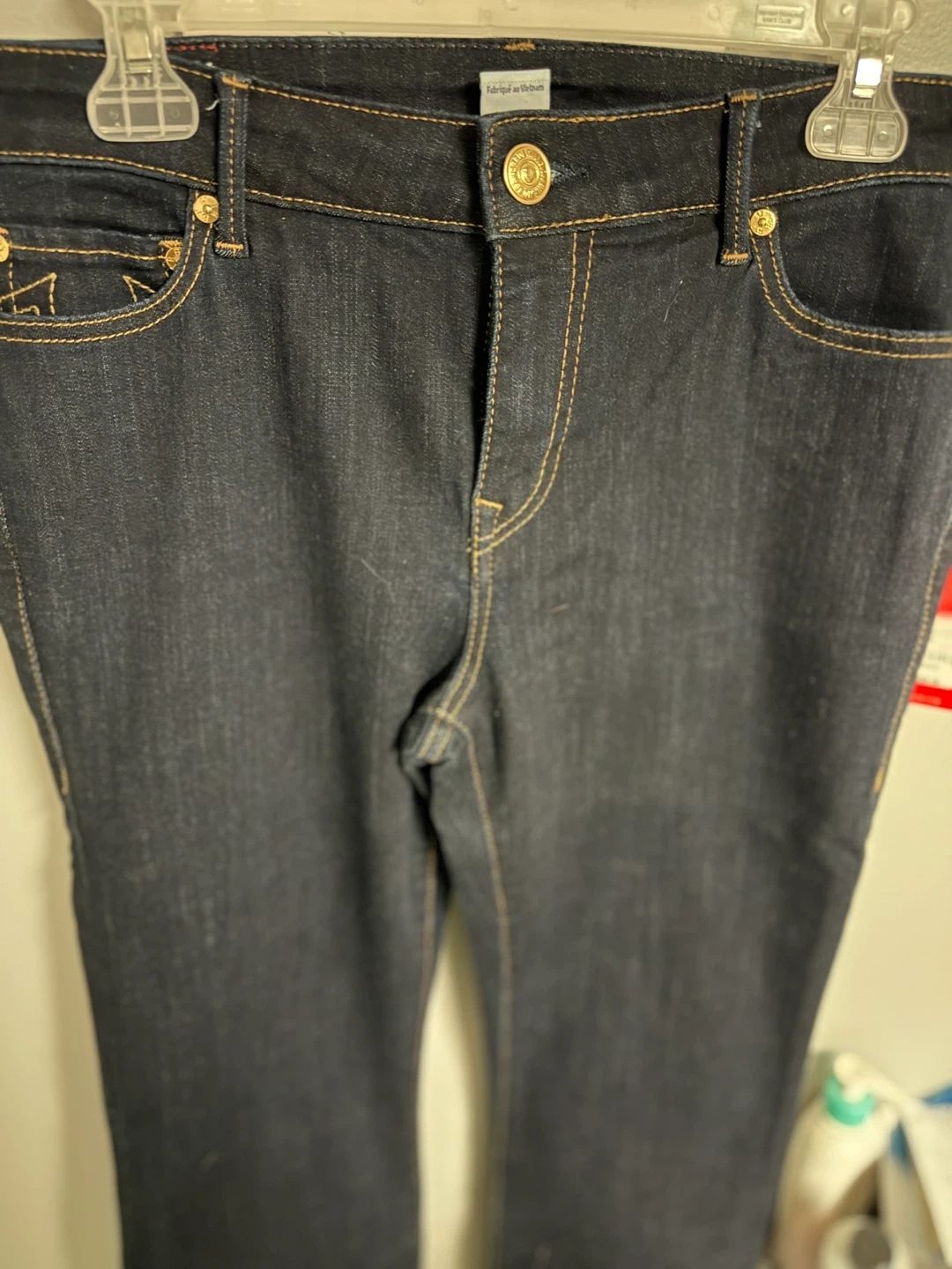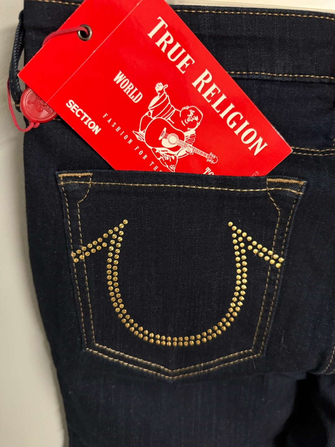These are True Religion jeans in a dark wash. They have gold stitching and decorative gold hardware. They're a stylish addition to any wardrobe!