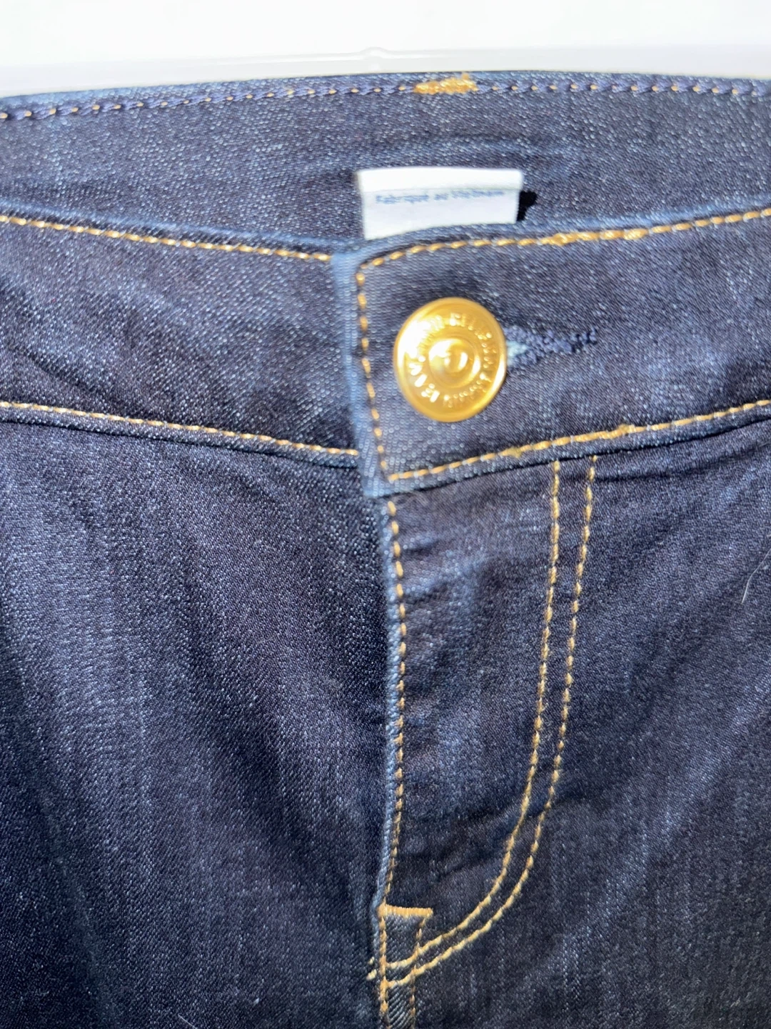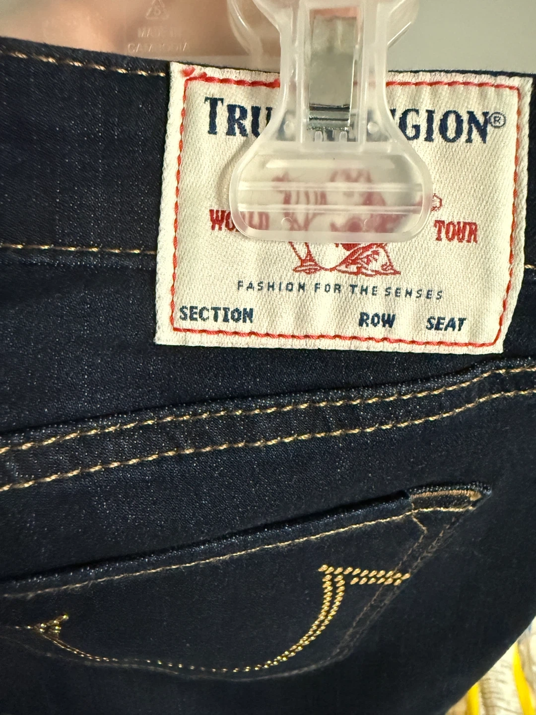These are True Religion jeans in a dark wash. They have gold stitching and decorative gold hardware. They're a stylish addition to any wardrobe!
