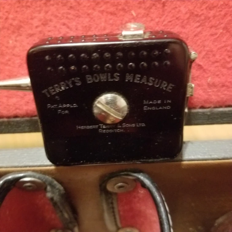 Selling a vintage lawn bowling set that comes with its original carrying case. The set includes four lawn bowling balls and a Terry's Bowls Measure. All items are neatly stored in a Christie brand case.