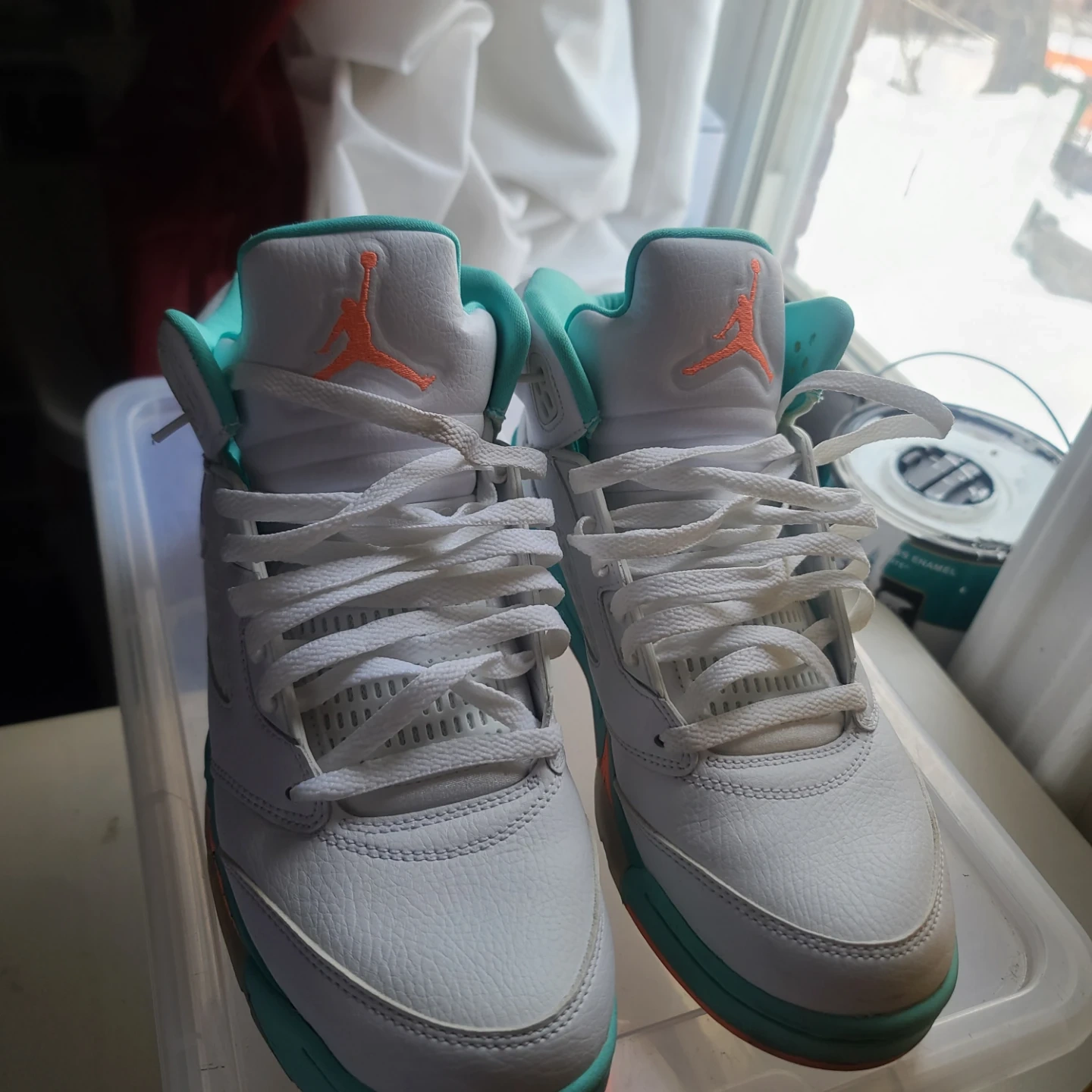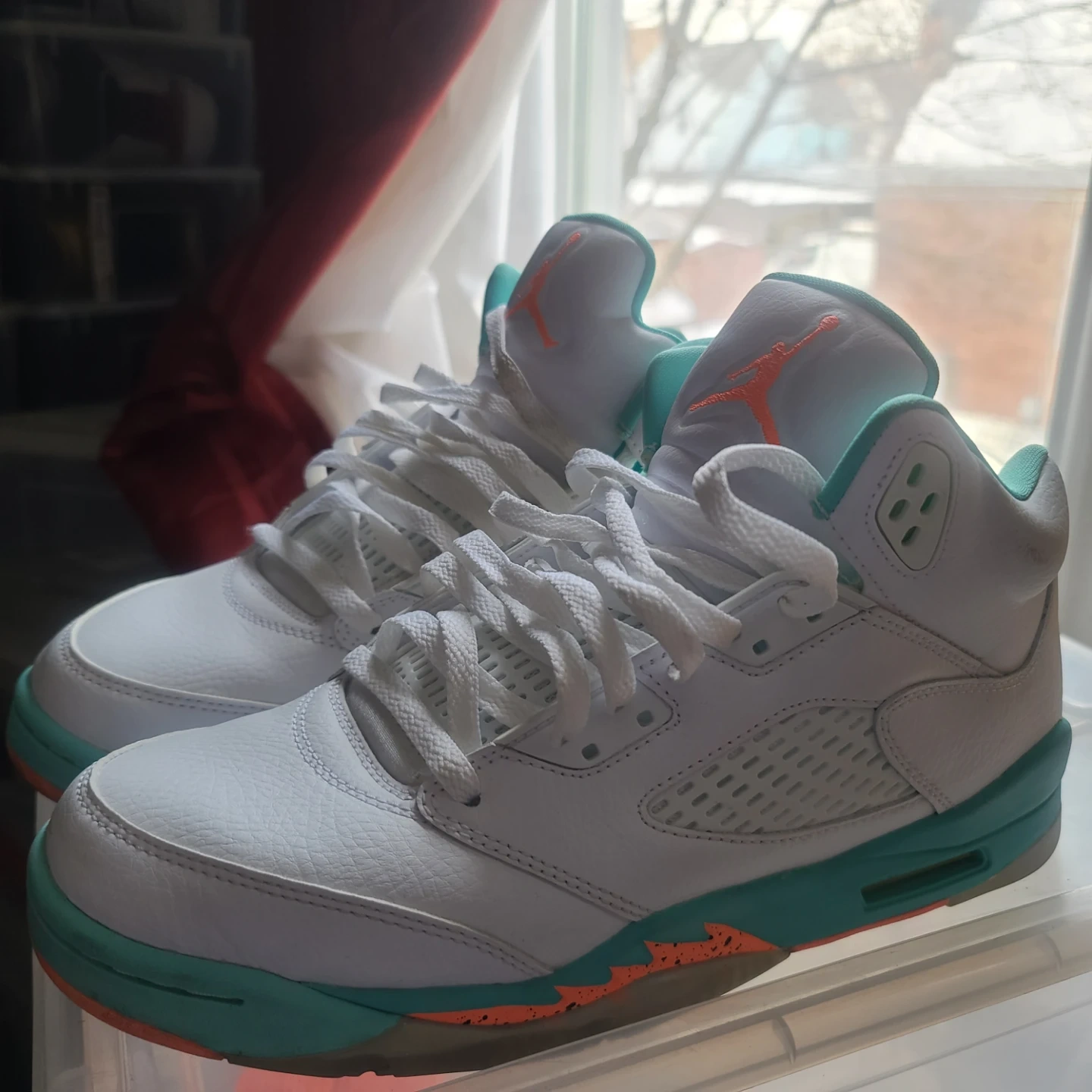 These Air Jordan 5 Retro TD sneakers feature a clean white leather upper with teal and orange accents. They're a classic basketball shoe design. Ideal for young sneaker enthusiasts!
