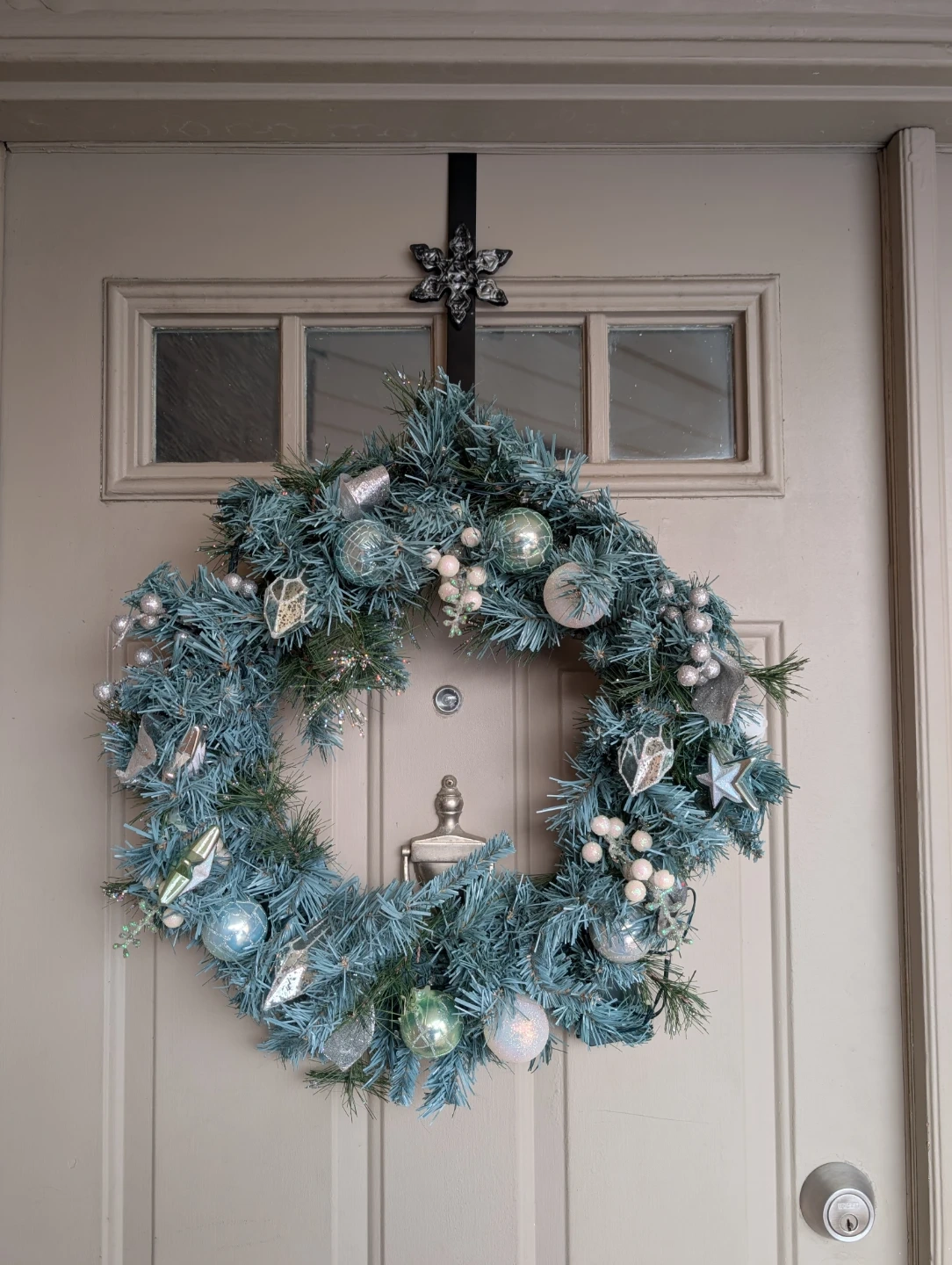 A festive blue spruce artificial Christmas wreath is decorated with silver and light green ornaments, white berries, and silver star accents. It's ready to bring some holiday cheer to your front door this season!