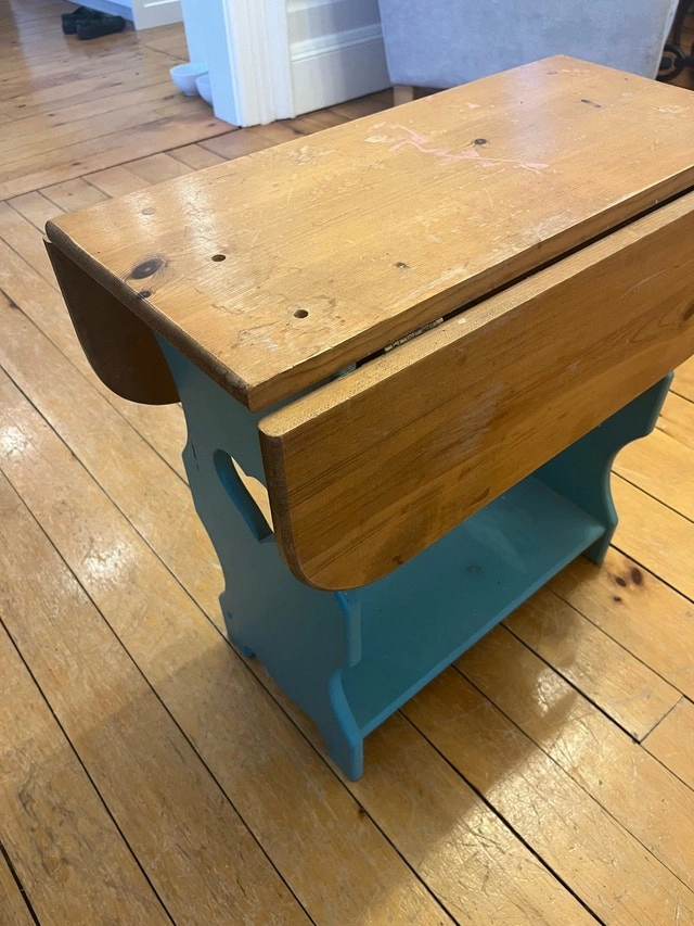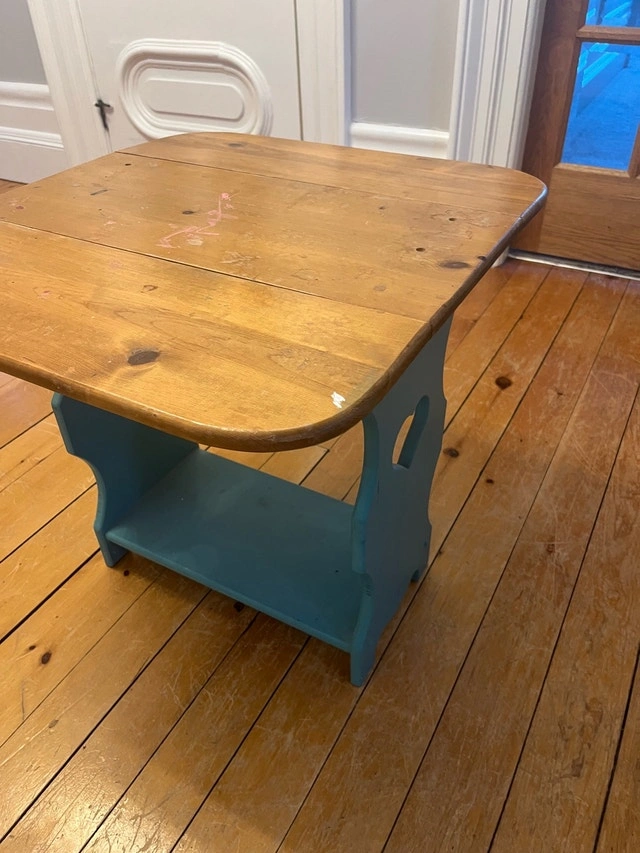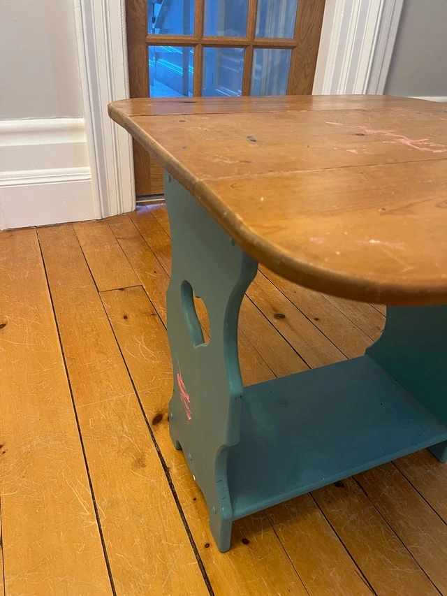 This folding, solid wood table functions as a side table or child's table that is perfect for arts, crafts, or snack time. This charming, sturdy table has seen its fair share of crayon masterpieces and tea parties, and it's ready for a new chapter. Showing signs of its previous life, it features a wooden top and teal accents. Measures: 24.5” W x 24.5” H x 12”L when completely folded, 18.5” L with one side up, 26” L with two sides up. Cash accepted.