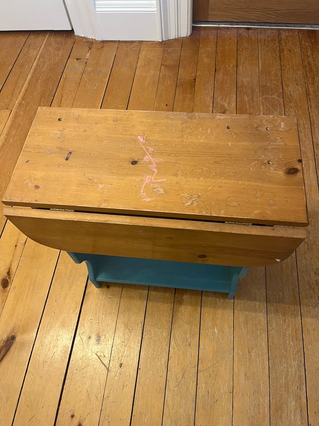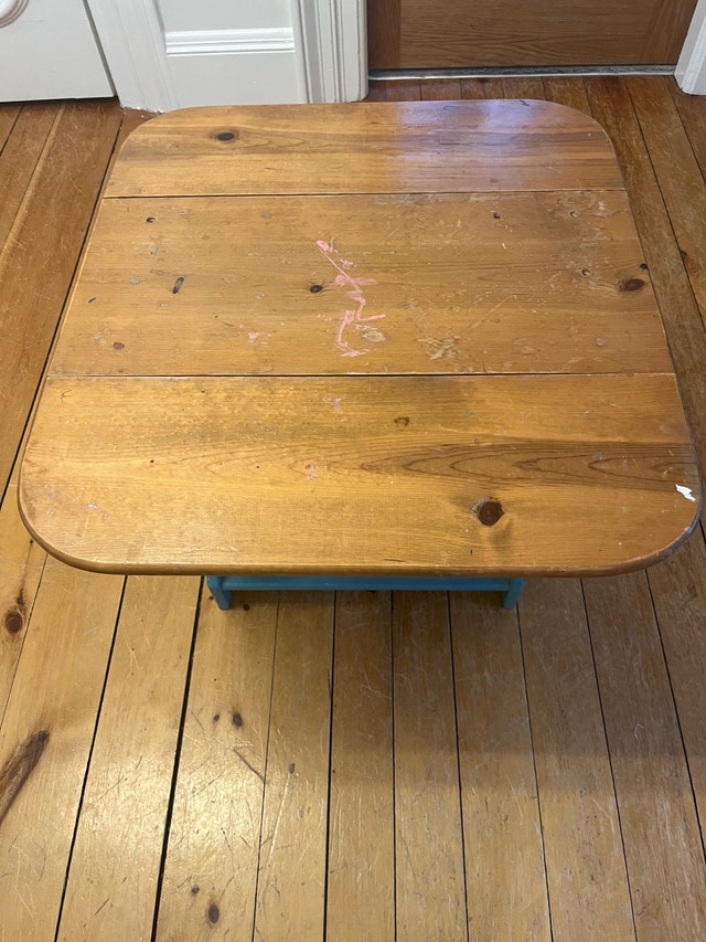 This folding, solid wood table functions as a side table or child's table that is perfect for arts, crafts, or snack time. This charming, sturdy table has seen its fair share of crayon masterpieces and tea parties, and it's ready for a new chapter. Showing signs of its previous life, it features a wooden top and teal accents. Measures: 24.5” W x 24.5” H x 12”L when completely folded, 18.5” L with one side up, 26” L with two sides up. Cash accepted.