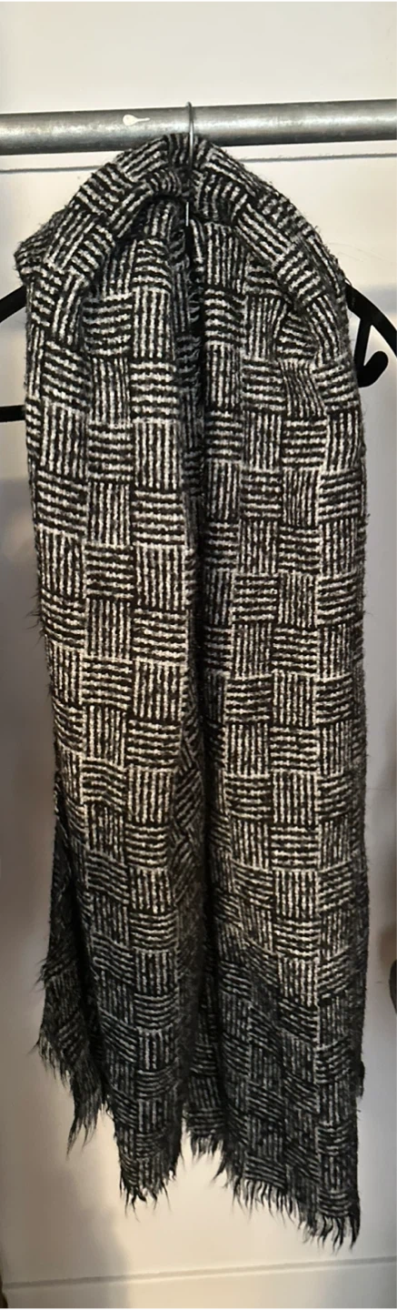 A stylish black and white scarf with a geometric pattern. It features fringed edges for added detail. This accessory is great for adding a bit of flair to any outfit!