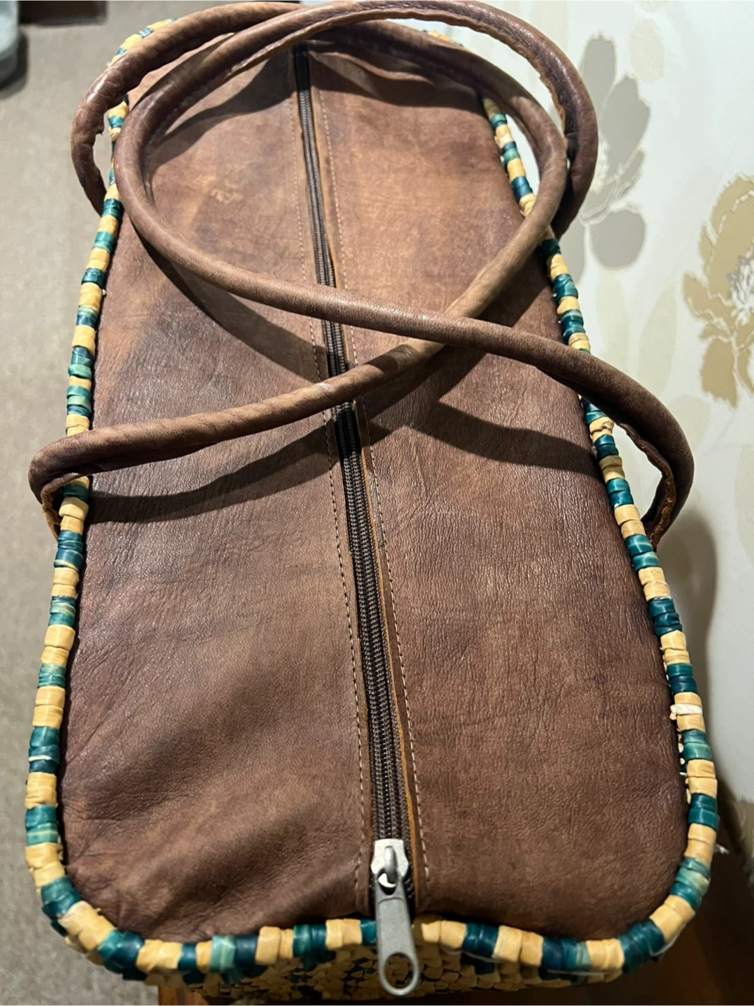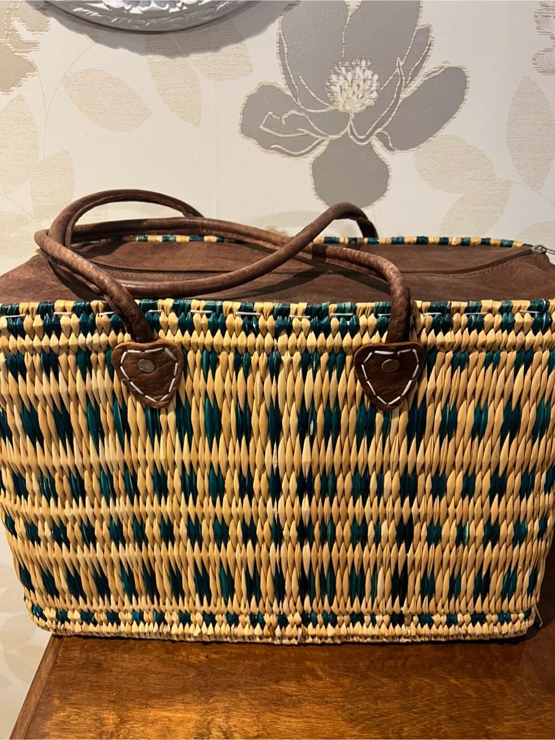Stylish woven tote bag with brown leather handles and trim. It features a secure zipper closure. This bag is great for day trips or as a beach accessory!