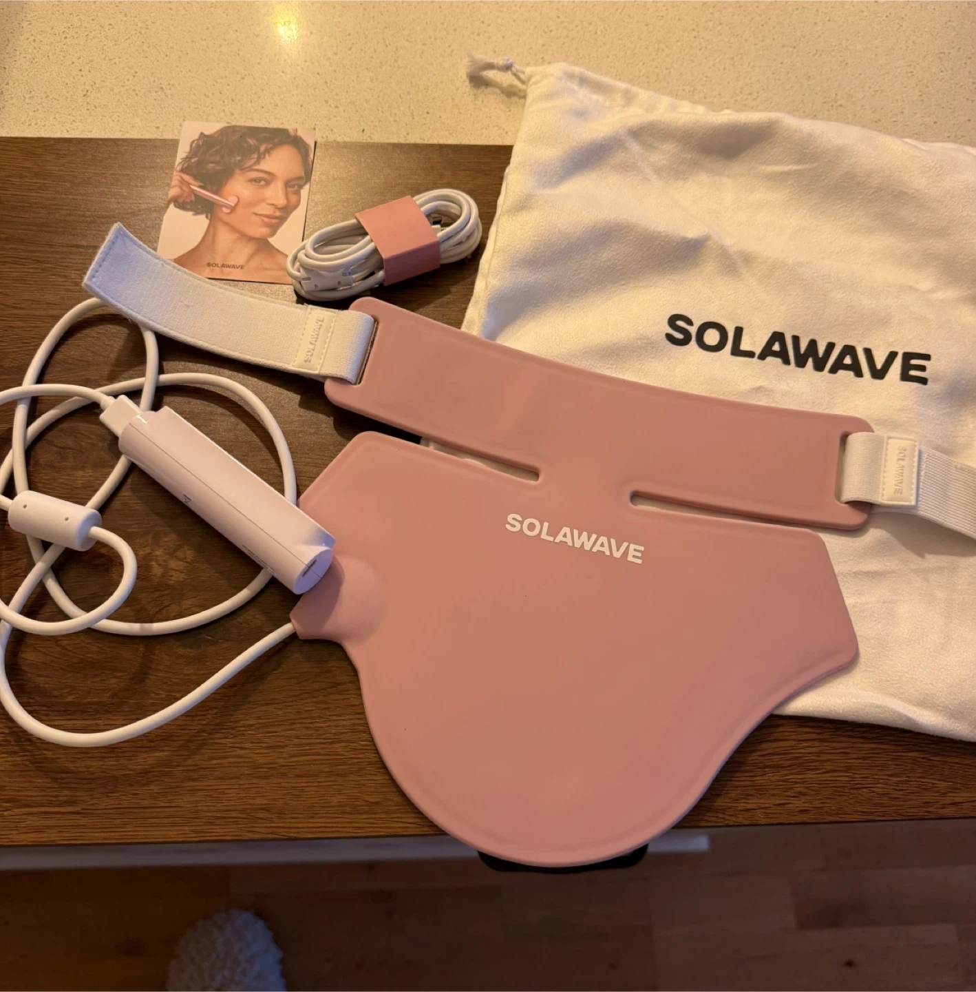 This SolaWave red light set includes a facial wand and a pink neck mask. It comes with a charging cable and a drawstring storage bag. Used for at-home skincare treatments.