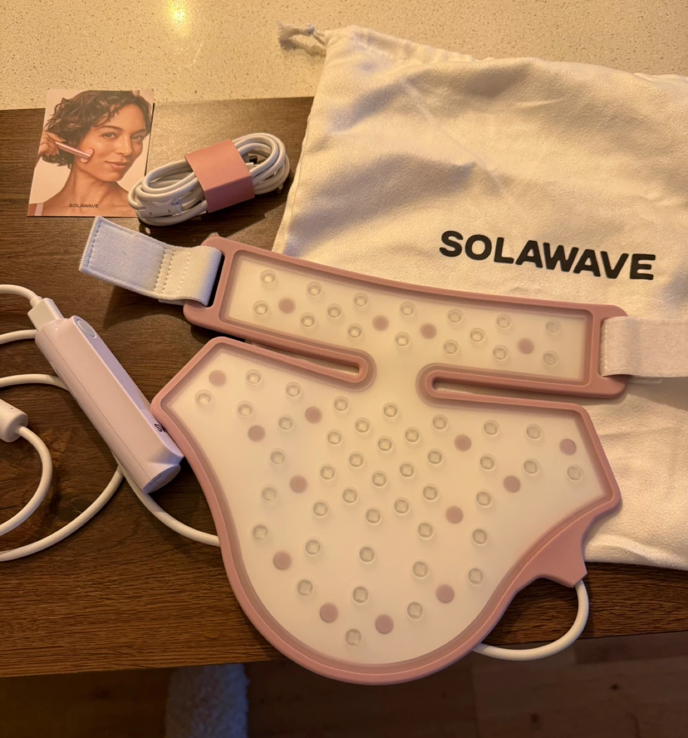 This SolaWave red light set includes a facial wand and a pink neck mask. It comes with a charging cable and a drawstring storage bag. Used for at-home skincare treatments.