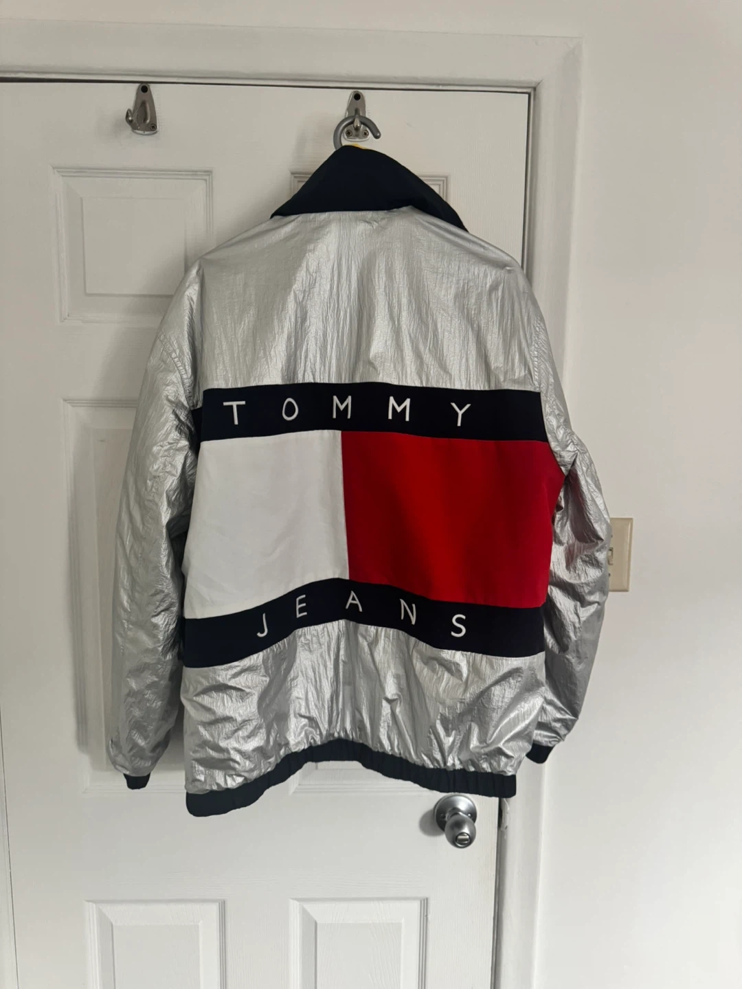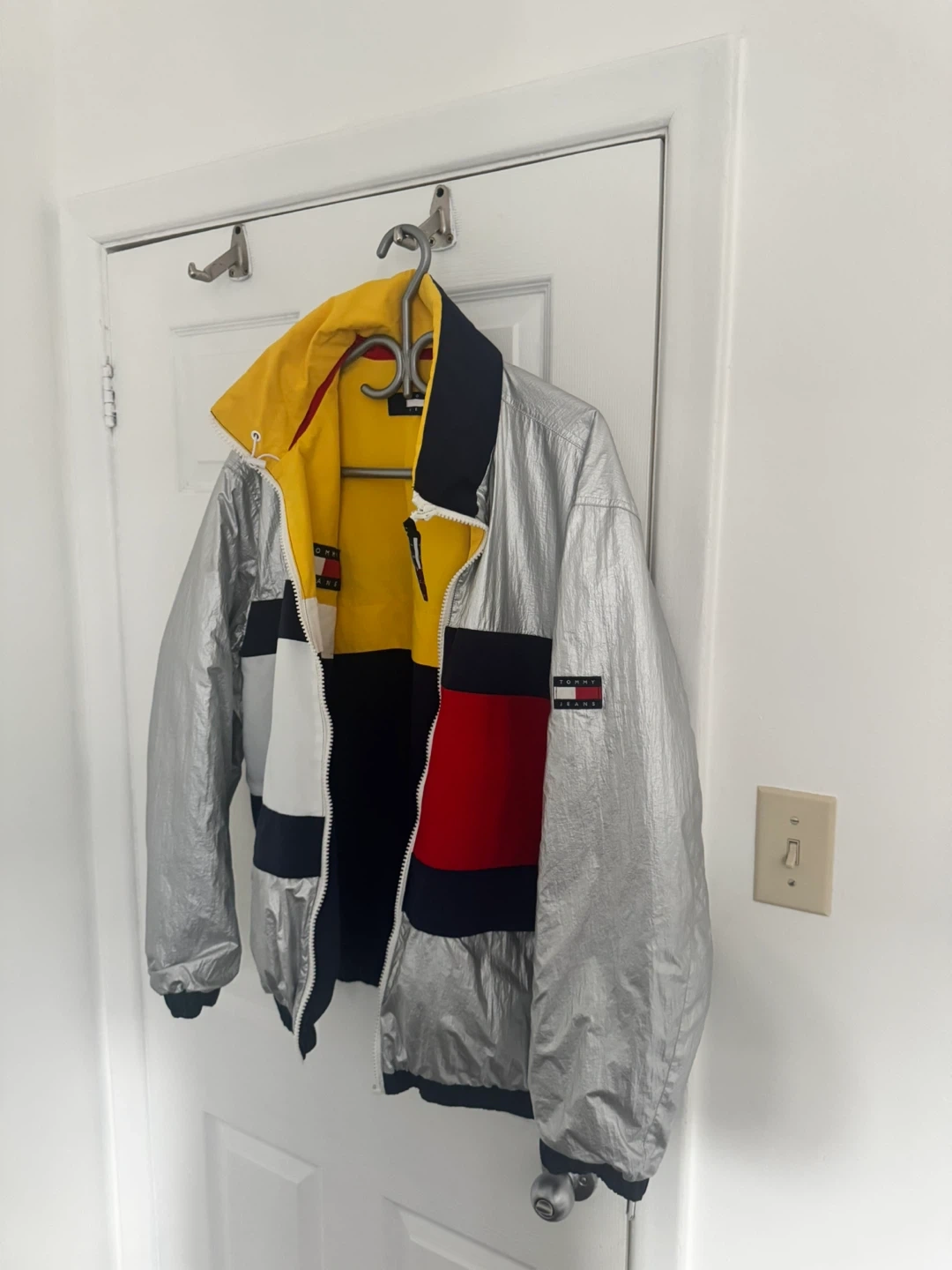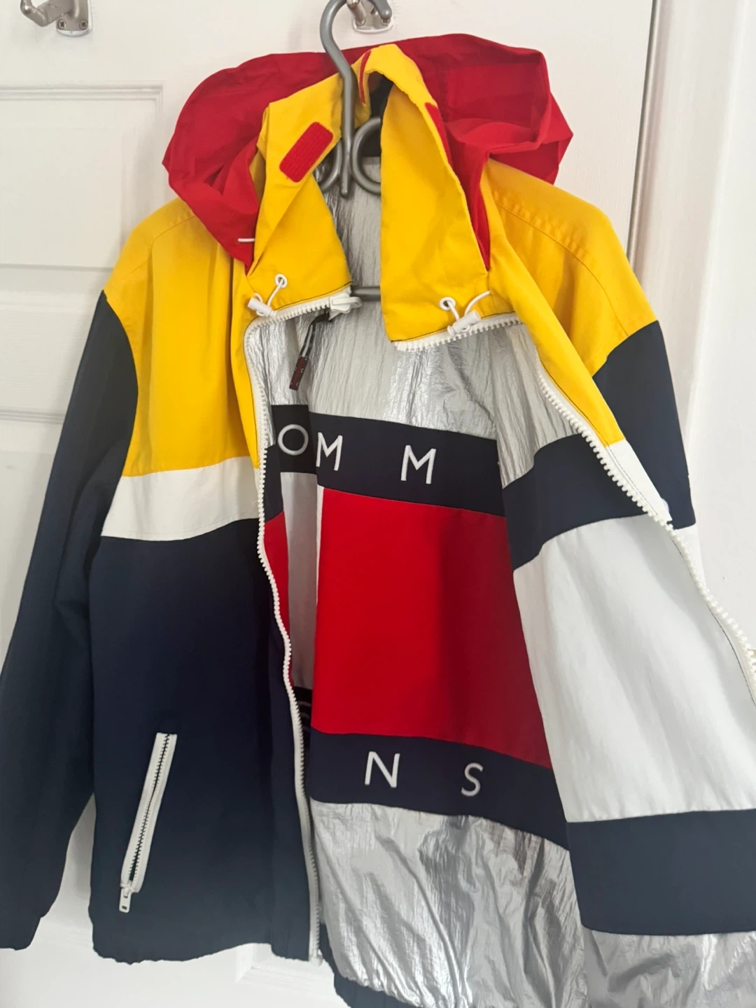 This is a Tommy Hilfiger reversible jacket. One side is silver with the iconic Tommy flag logo. The other side features a colour-block design with yellow, navy, and red. It's a great statement piece!