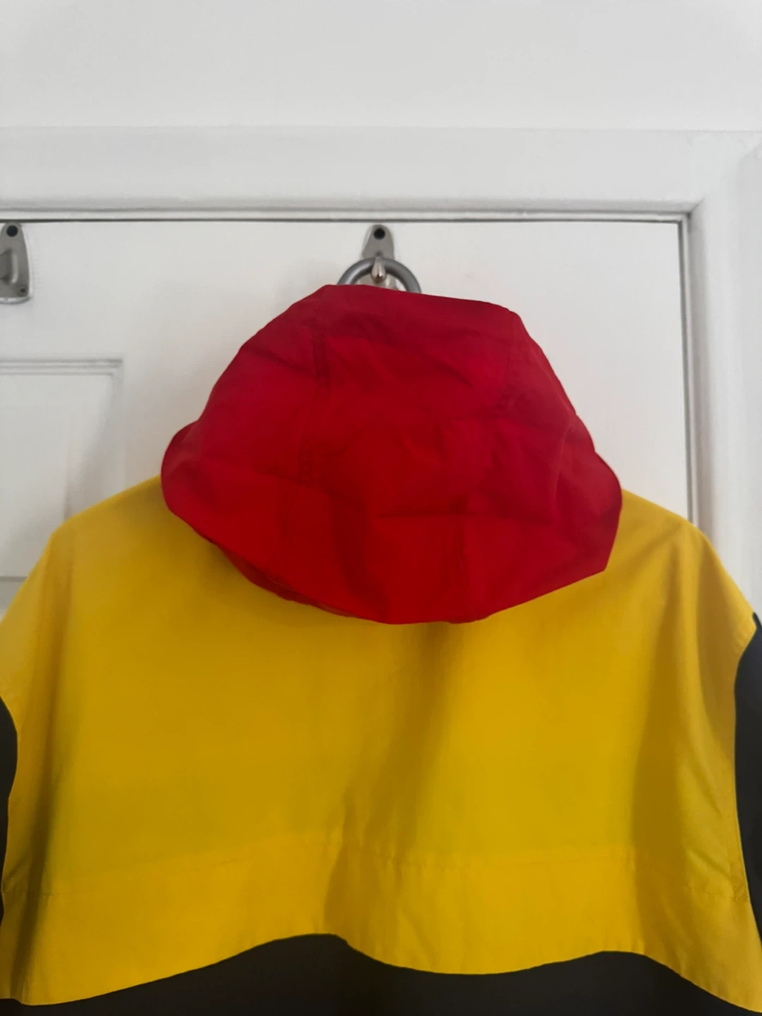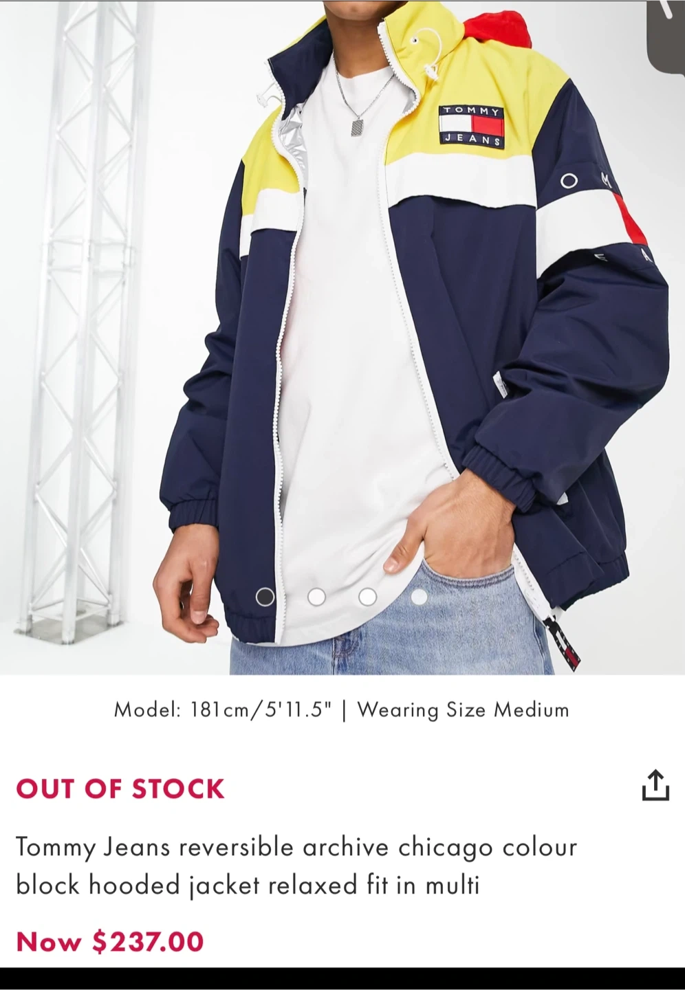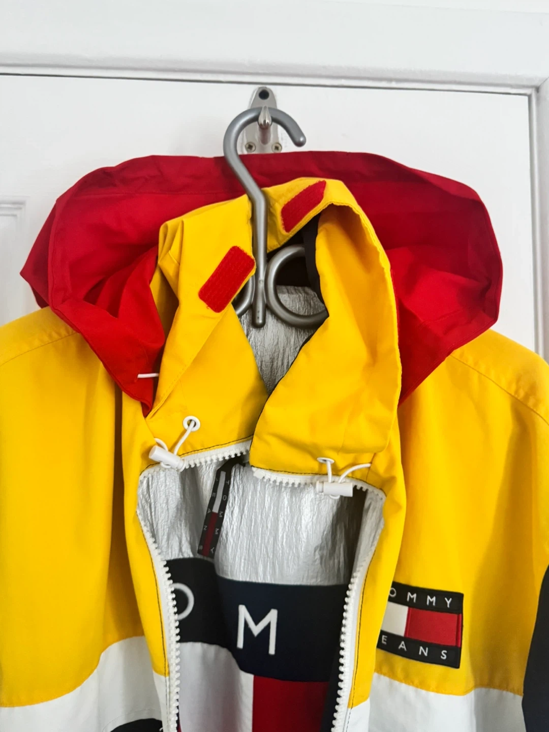 This is a Tommy Hilfiger reversible jacket. One side is silver with the iconic Tommy flag logo. The other side features a colour-block design with yellow, navy, and red. It's a great statement piece!