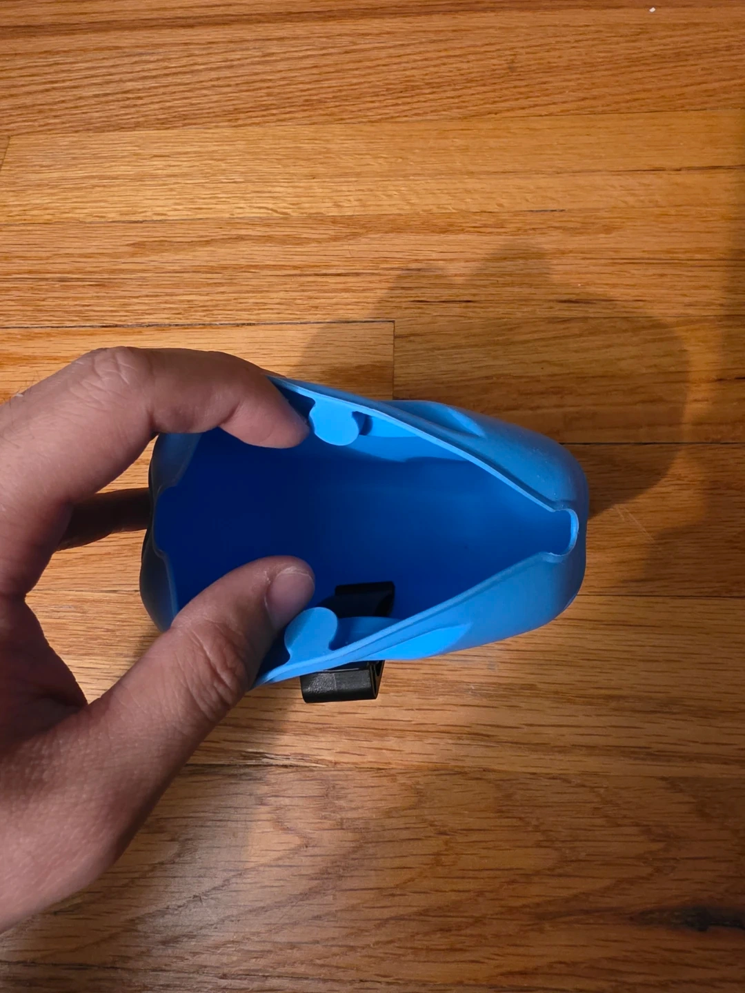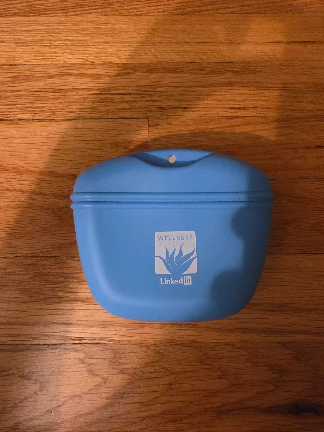 This blue bag has "WELLNESS" and "Linked in" logos printed on it. It's made of a flexible material with a black clip closure. The inside is bright blue.