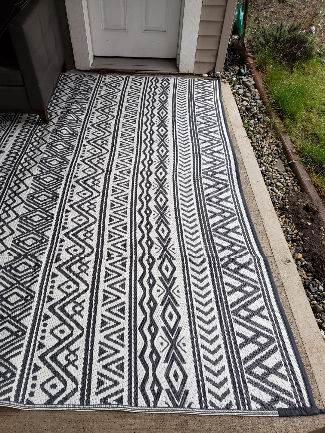 This large outdoor rug features a stylish black and white geometric design. It's perfect for adding comfort and decoration to your patio, deck, or balcony. Made from durable, weather-resistant material. Great for outdoor living spaces! And portable for camping sites flooring.