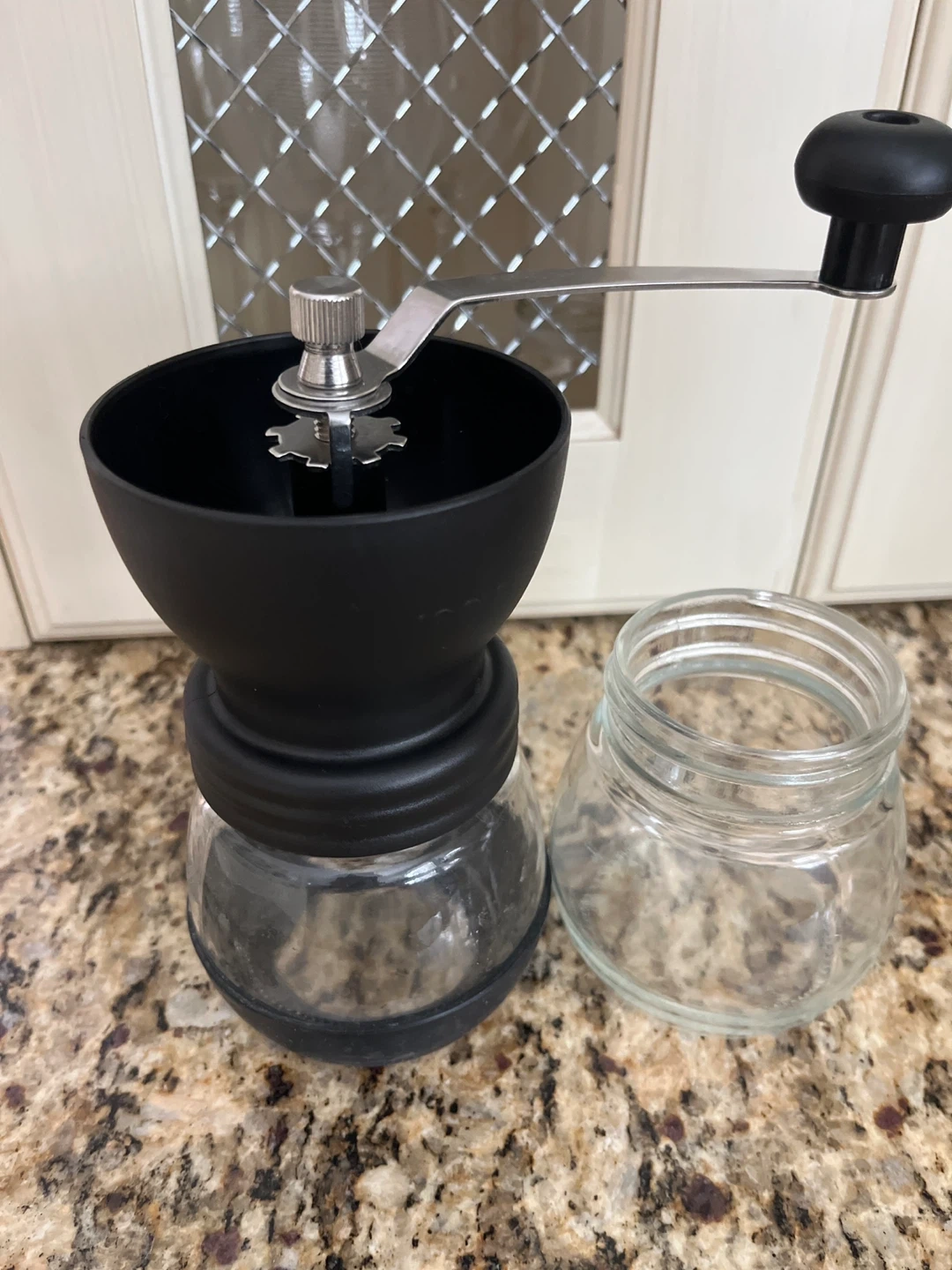 Manual coffee grinder with a crank handle and 2 glass jars. It’s black with stainless steel components. This grinder allows for adjustable grind size for different coffee brewing methods.